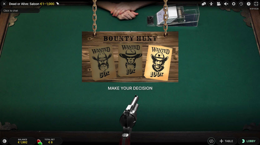 - ディーラーがバウンティカードを配った場合、ゲームは別の画面に切り替わり、プレイヤーは3枚の裏向きのカードから1枚を選択します。選択後、3枚のカードが公開され、それぞれに乗数が表示されます。選択された乗数の値が潜在的勝利額に加算されます。