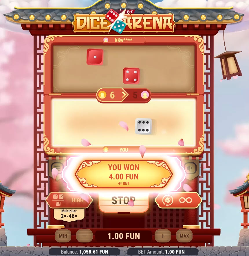 上の画像では、私は「ハイ」モードで1ドル賭けました。つまり、ディーラーのサイコロ2個に対して私のサイコロ1個が出ました。私の6はディーラーの合計5を上回りました。つまり、私の勝ちは4対1でした。