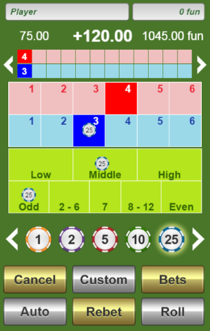 - 中 — 少なくとも1つのサイコロが3または4の目。配当は4~5。