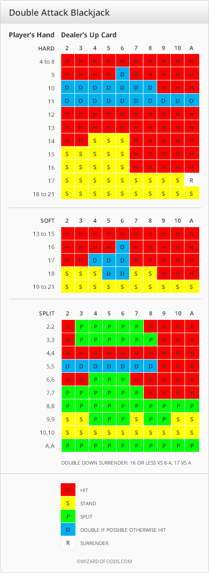 以下はダブルアタックブラックジャックの基本戦略です。「ダブルダウン・サレンダー」とは、ダブルダウン後にいつ降伏するかを指します。