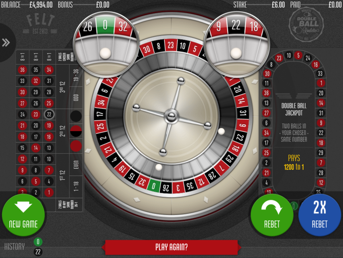 Felt Gamingのシングルゼロ・ダブルボールルーレットゲームのスクリーンショットをいくつかご紹介します。どちらかの画像をクリックすると拡大表示されます。