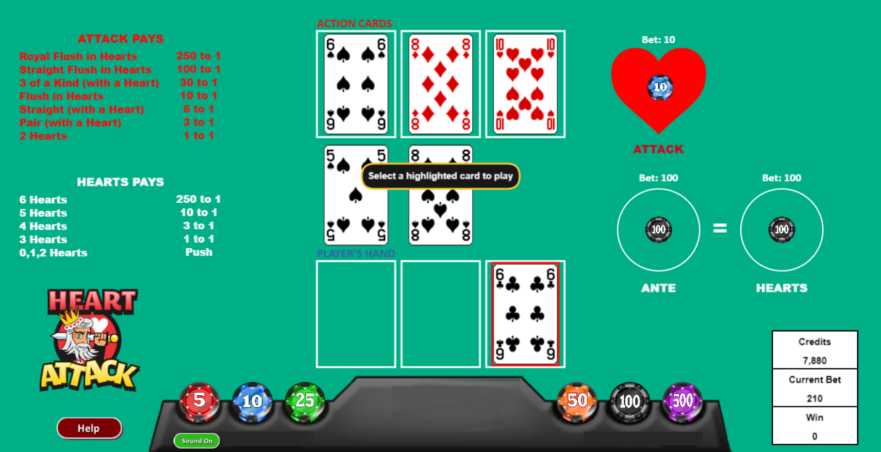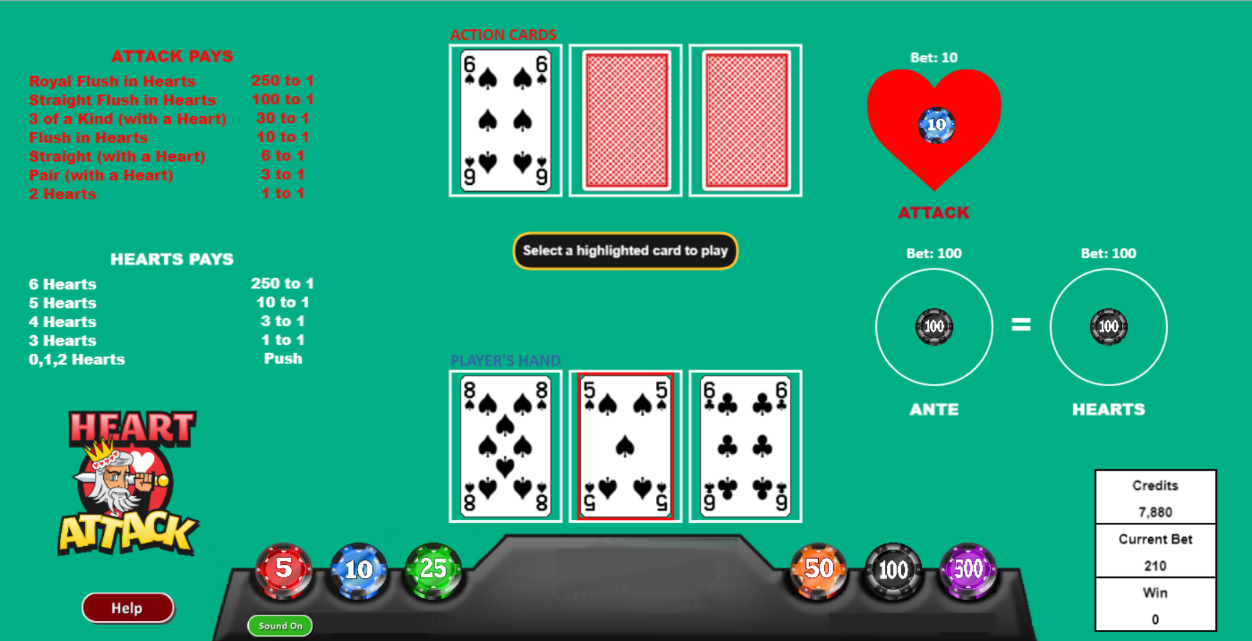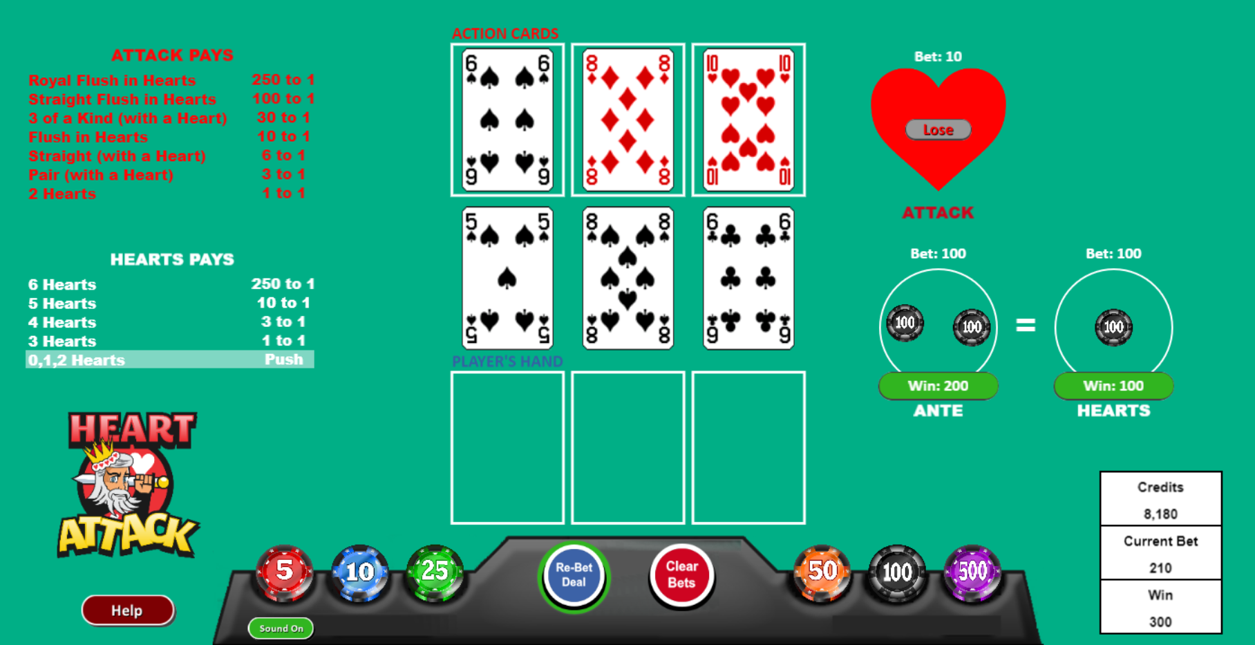 以下は無料デモゲームでプレイしたゲームの例です。最初の画像では、アンティとハートにそれぞれ100ドル、アタックに10ドル賭けています。これは、3枚のカードすべてがディーラーの最初のカードとランクまたはスーツが一致しているため、ハートを含まずに3枚のカードを全てプレイできる珍しい状況です。