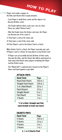 ハートアタックは、私の知る限り、2019年初頭にコネチカット州のフォックスウッズ・カジノで初登場したテーブルゲームです。ルールは他の既知のゲームと比較するのが難しいですが、強いて言えばウノに似ています。プレイヤーはディーラーが出したカードのランクまたはスーツを一致させることで、手札をなくそうとします。さらに、ハートはワイルドカードです。