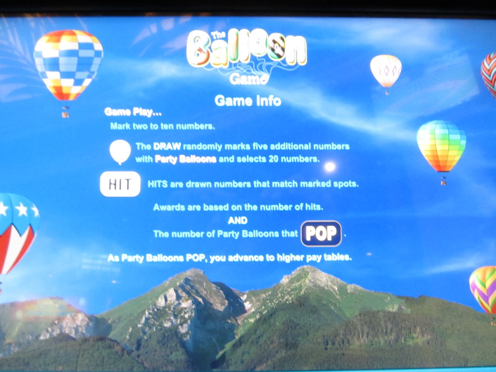 バルーンゲームは、U1 Gaming社製のマルチゲーム機でプレイできる、キノをベースにしたゲームです。ラスベガスのラスベガス・クラブ、ランパート、ドッティーズといったカジノで見かけたことがあります。バルーンゲームは、卵3個ではなく風船5個を使う点を除けば、ケイブマン・キノに似ています。