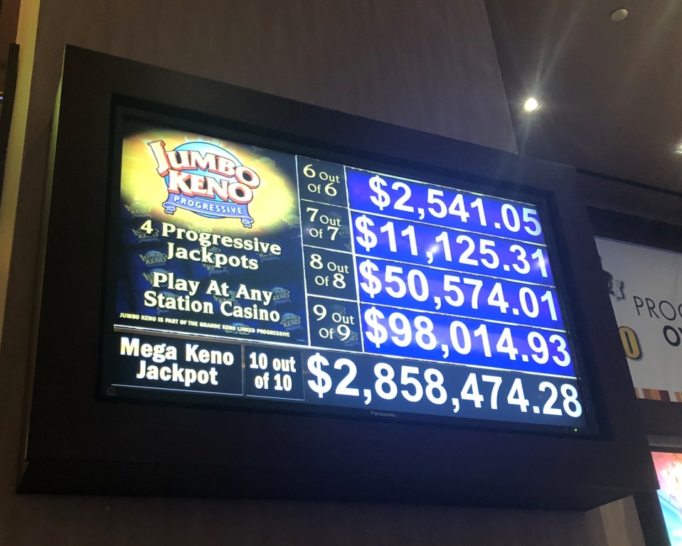 ラスベガスのステーションズカジノでは、5種類のプログレッシブキノゲームを提供しています。そのうち4種類、ピック6、ピック7、ピック8、ピック9は「ジャンボキノプログレッシブ」と呼ばれています。5種類目のピック10は「メガ10」と呼ばれています。ルールカードによると、メガ10はステーションカジノ限定ではなく、ネバダ州の他のカジノでもプレイできます。ジャンボプログレッシブゲームはすべて1ドルベットのみで、メガ10は1.50ドルです。