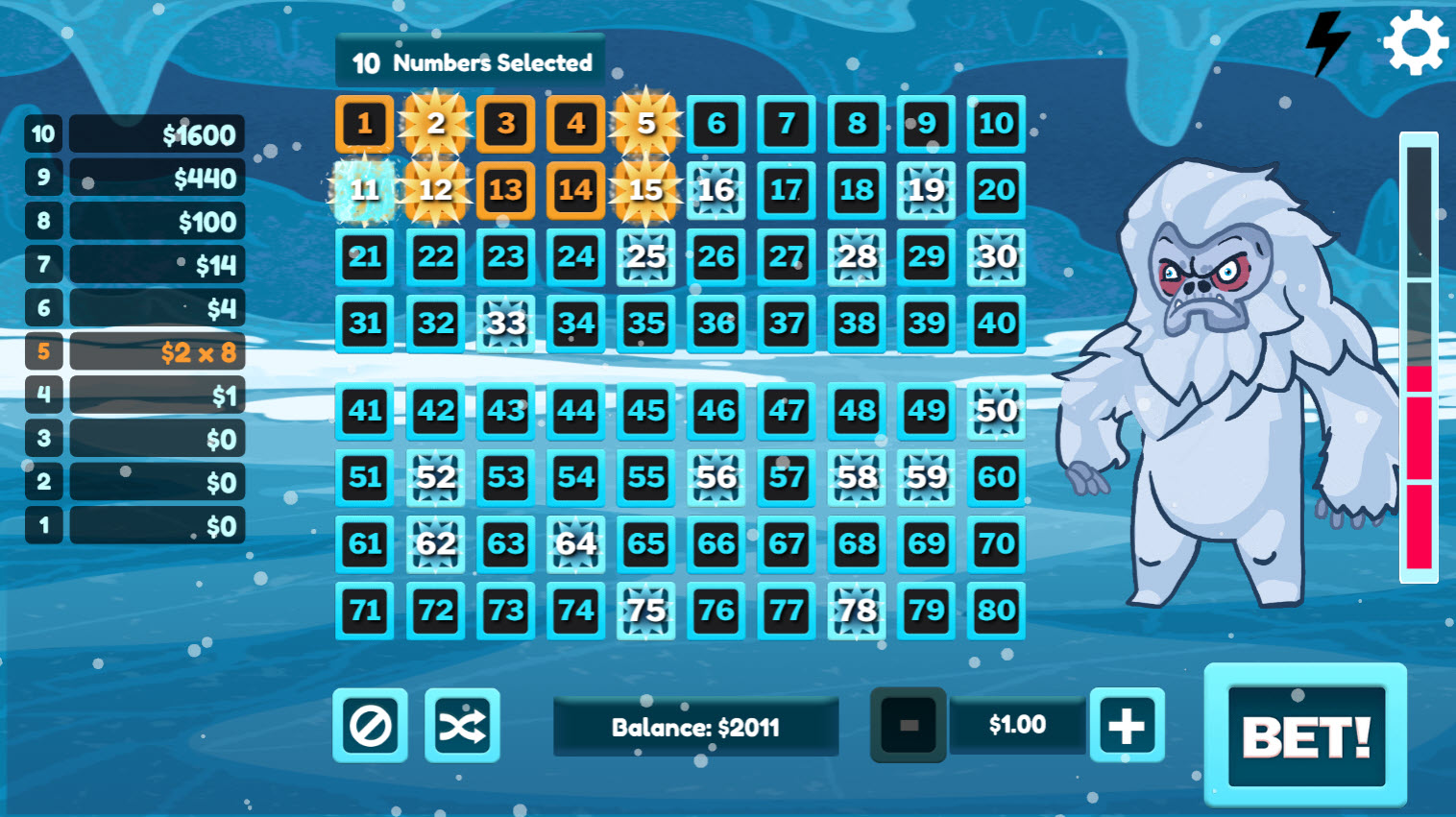 Mad Yeti Keno のルールは通常のKenoと同じですが、プレイヤーが抽選された 20 番目のボールをキャッチした場合、勝ち金が 8 倍になります。つまり、最後に抽選されたボールがキャッチだった場合、勝ち金が 4 倍ではなく 8 倍になる点を除けば、 Power Kenoと同じです。