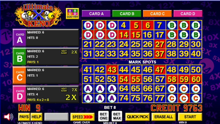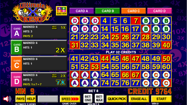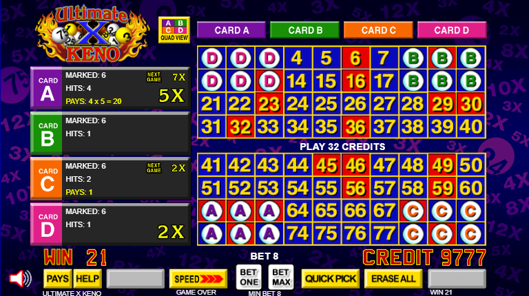 アルティメットXキノは通常の4カードスポットキノと同じようにプレイできますが、インスタントウィンに加えて、同じカードで次のゲームにマルチプライヤーが付与されます。この機能を利用するには、賭け金を2倍にする必要があります。現在のゲームの勝利金は、賭け金の半分に基づいて決定されます。