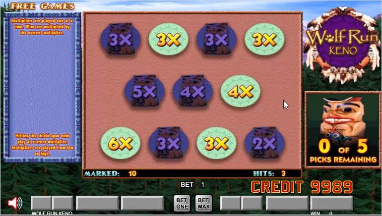 上の画像では、私がピックをそのままにすることを選択しています。10個のマークスポットにはX印が付いています。5個のボーナススポットには狼のマークが付いています。左側のパネルには、私のマルチプライヤーが表示されています。3倍のマルチプライヤーのうち1つがハイライト表示されており、次のゲームに適用されます。