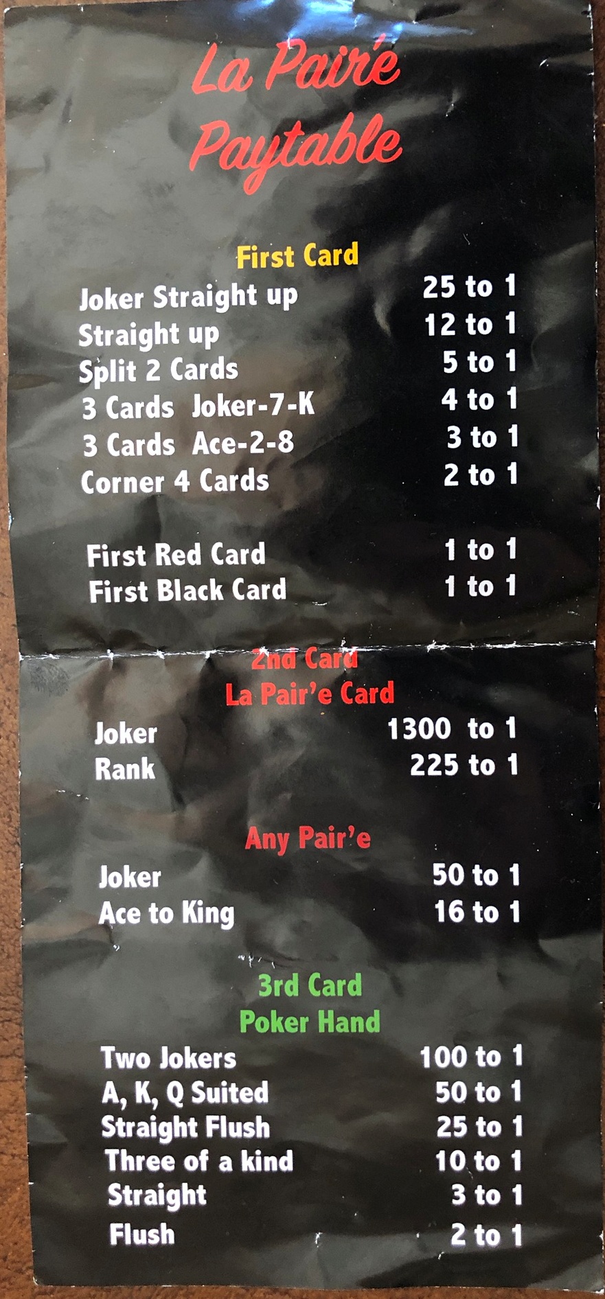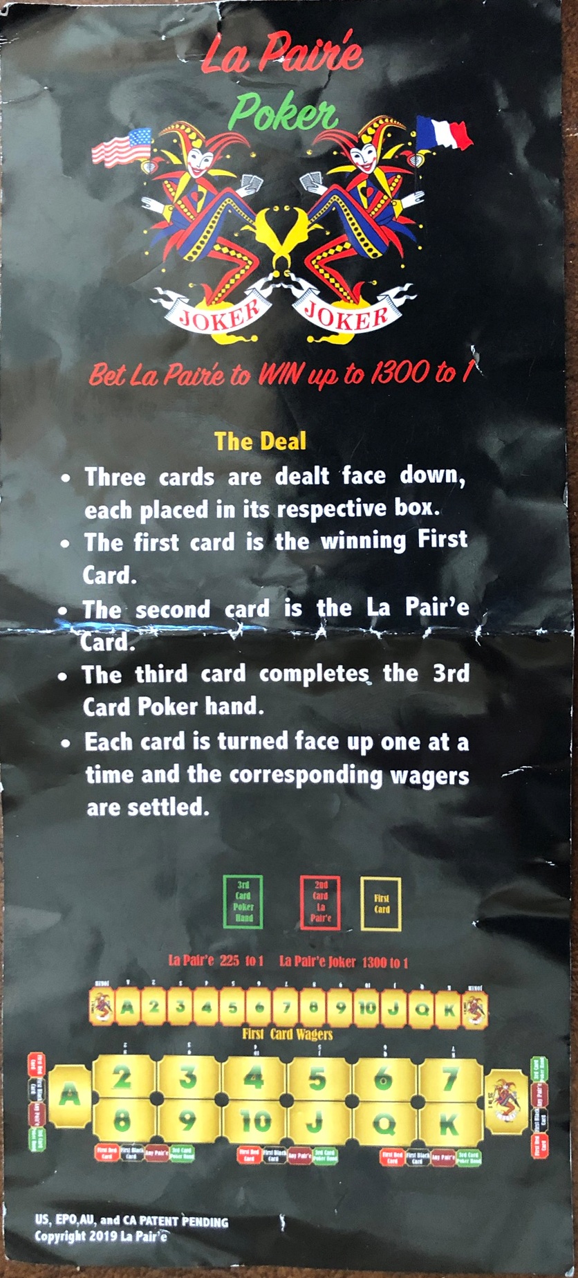 ラ・ペアは2019年9月19日、ネバダ州エル・コルテスでフィールド試験を開始しました。このゲームを簡単に説明するのは難しいですが、強いて言えば、ルーレットとスリーカードポーカーを合わせたようなゲームです。タイトルはフランス語で「ペア」を意味します。