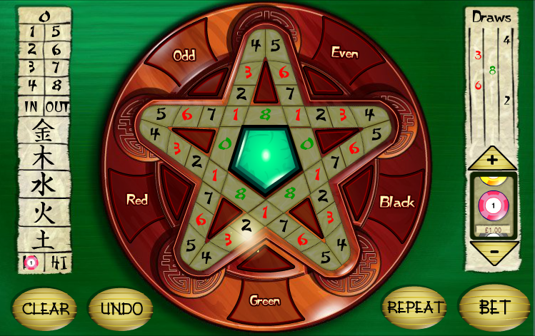 - 金、木、水、火、土:これらは五芒星の五行を表す五行のシンボルです。それぞれが五芒星の1行をカバーします。2つのスポットは交差点にあるため、重みが2倍になります。したがって、それぞれの当たりの合計は2×2 + 7 = 11となります。