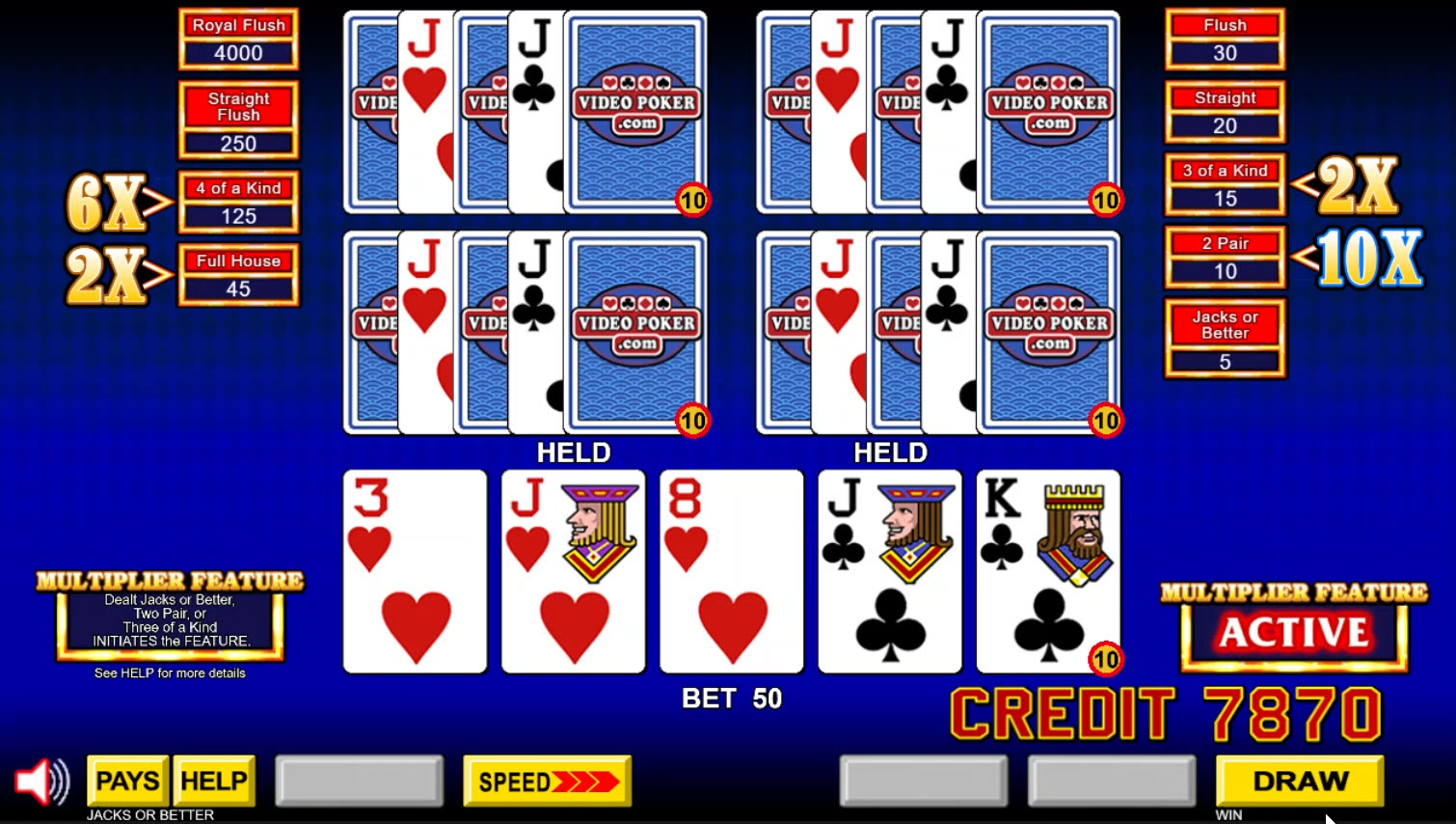 - ジャック・オア・ベター ベースのゲームでは、ツーペア、スリー・オブ・ア・カインド、フル・アワー、フォー・オブ・ア・カインドに改善すると乗数が与えられます。