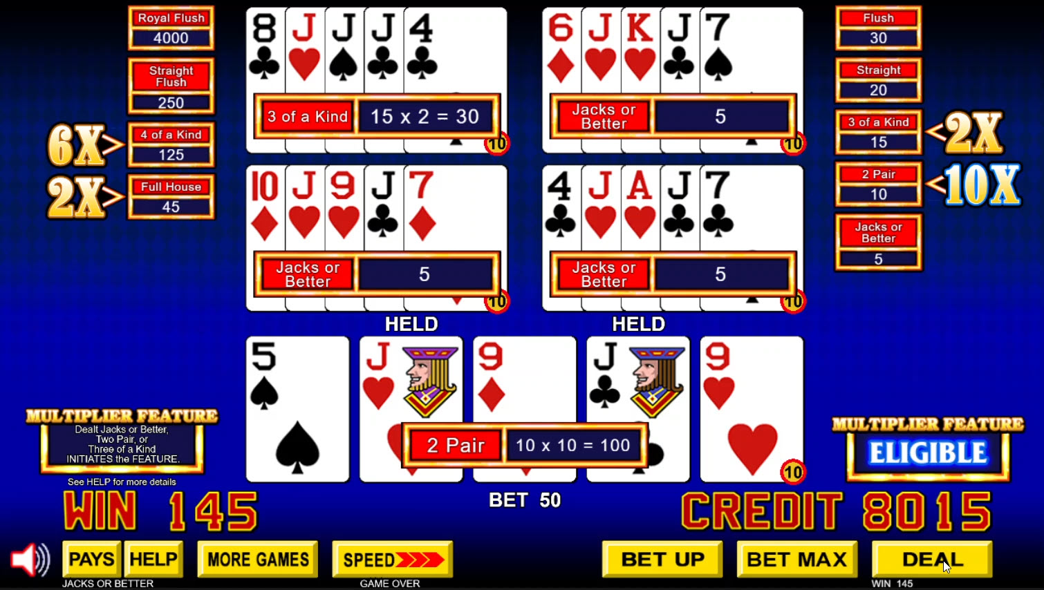 下の手札はツーペアに進化し、10倍のマルチプライヤーを獲得し、5×2×10 = 100の勝利となりました。左上の手札はスリーカードに進化し、2倍のマルチプライヤーを獲得し、5×3×2 = 30の勝利となりました。他の3つの手札は進化せず、3×5 = 15の勝利となりました。合計勝利額は100+30+15=145でした。