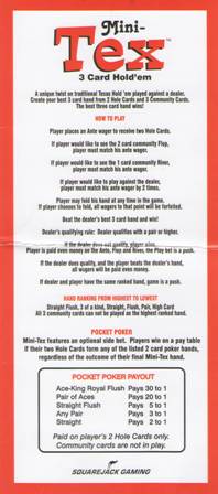 ミニテックスは、ディーラーと対戦するテキサスホールデムスタイルのゲームです。2枚のポケットカードと3枚のコミュニティカードを使って、ディーラーよりも強い3枚のポーカーハンドを作ることで勝利を目指します。