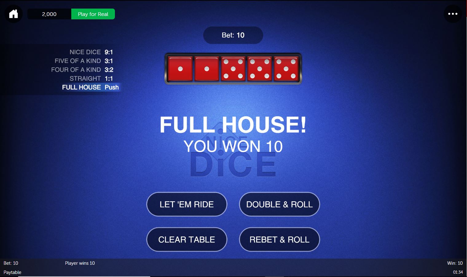 - プレイヤーが最初のロールで 5 種類の同じ目が出ると、「ナイス ダイス」と呼ばれ、即座に 9 対 1 のオッズで支払われます。