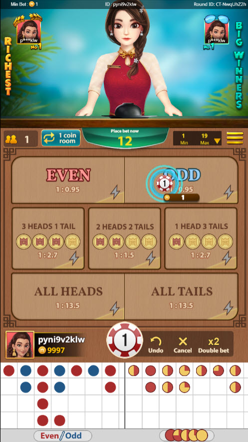 - 奇数/偶数 (表と裏が 1-3 または 3-1 に分かれた場合は奇数ベットが勝ち、0-4、2-2、または 4-0 に分かれた場合は偶数ベットが勝ちます)。