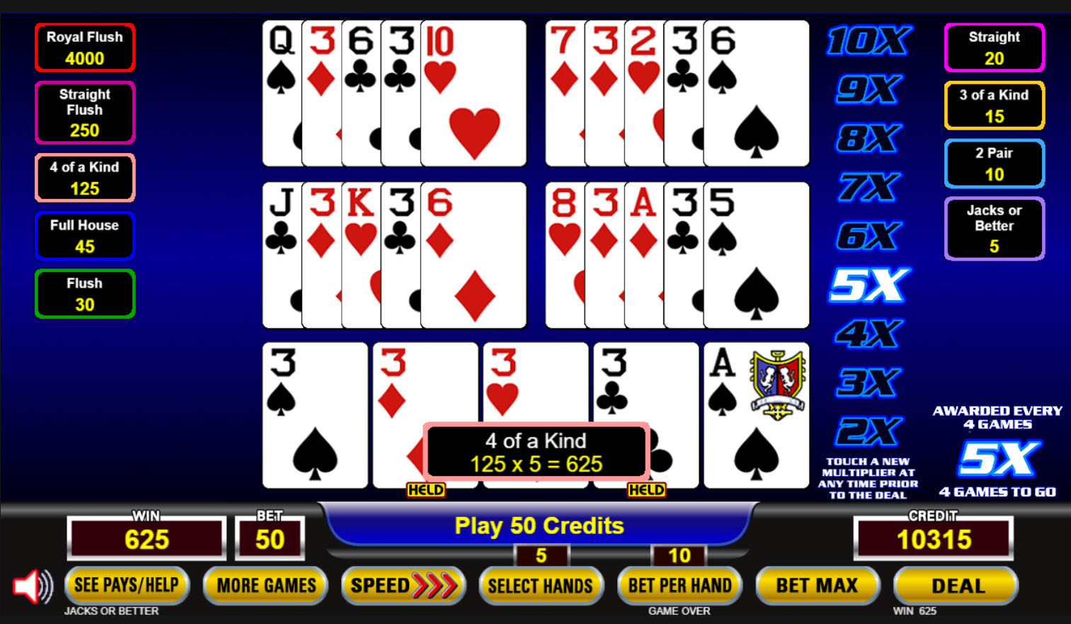 上記のハンドでは、5倍のマルチプライヤーを選択しました。マルチプライヤーを獲得する番になった時、3が2枚配られ、それをホールドしました。下のハンドでは、通常5クレジットのベットで125クレジットの配当となるフォー・オブ・ア・カインドにまで上がりました。5倍のマルチプライヤーでは、5×125 = 625クレジットの勝利となりました。