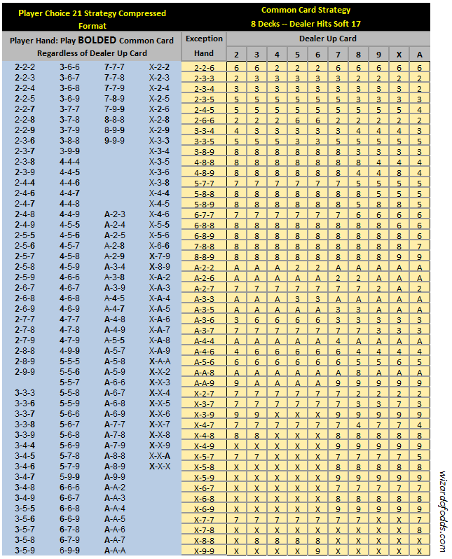 以下の表は、プレイヤーの3枚のカードとディーラーのアップカードに応じて、どのカードを共通カードとしてプレイするかを示しています。この表は「ソフト17でヒット」ゲーム用ですが、ソフト17でスタンドするゲームにも適用できます。