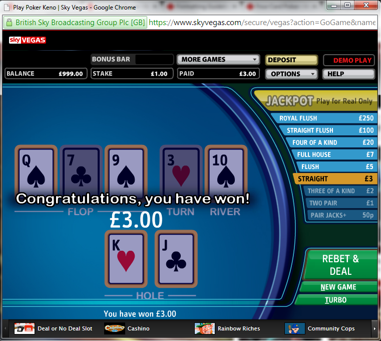ポーカー・キノは、スカイベガス・インターネットカジノでプレイできるシンプルなポーカーベースのゲームです。プレイヤーはテキサスホールデムスタイルでベットし、7枚のカードが配られます。ジャックのペア以上があれば勝ちです。キノとどう関係があるのかはよく分かりませんが、おそらく特別なスキルは必要ないからでしょう。完全に運任せのゲームです。