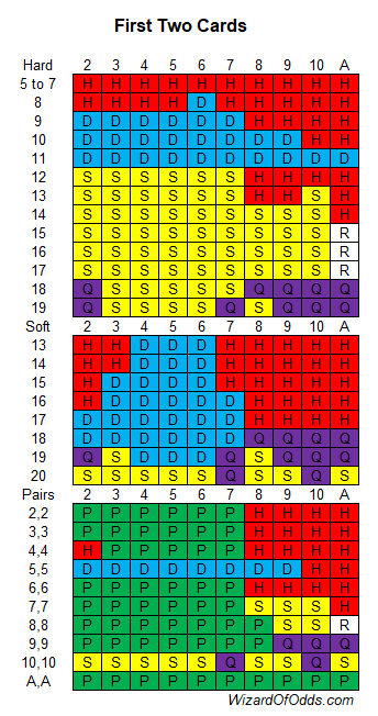 無限デッキの分析に基づくと、ベースゲームのハウスエッジは1.33%となります。これは、プレイヤーの予想損失額と初期ベット額2ユニットの比率です。従来のブラックジャックの分析では、無限デッキから6デッキにするとハウスエッジが0.1%減少することが示されています。この調整を適用すると、ハウスエッジは1.23%になります。