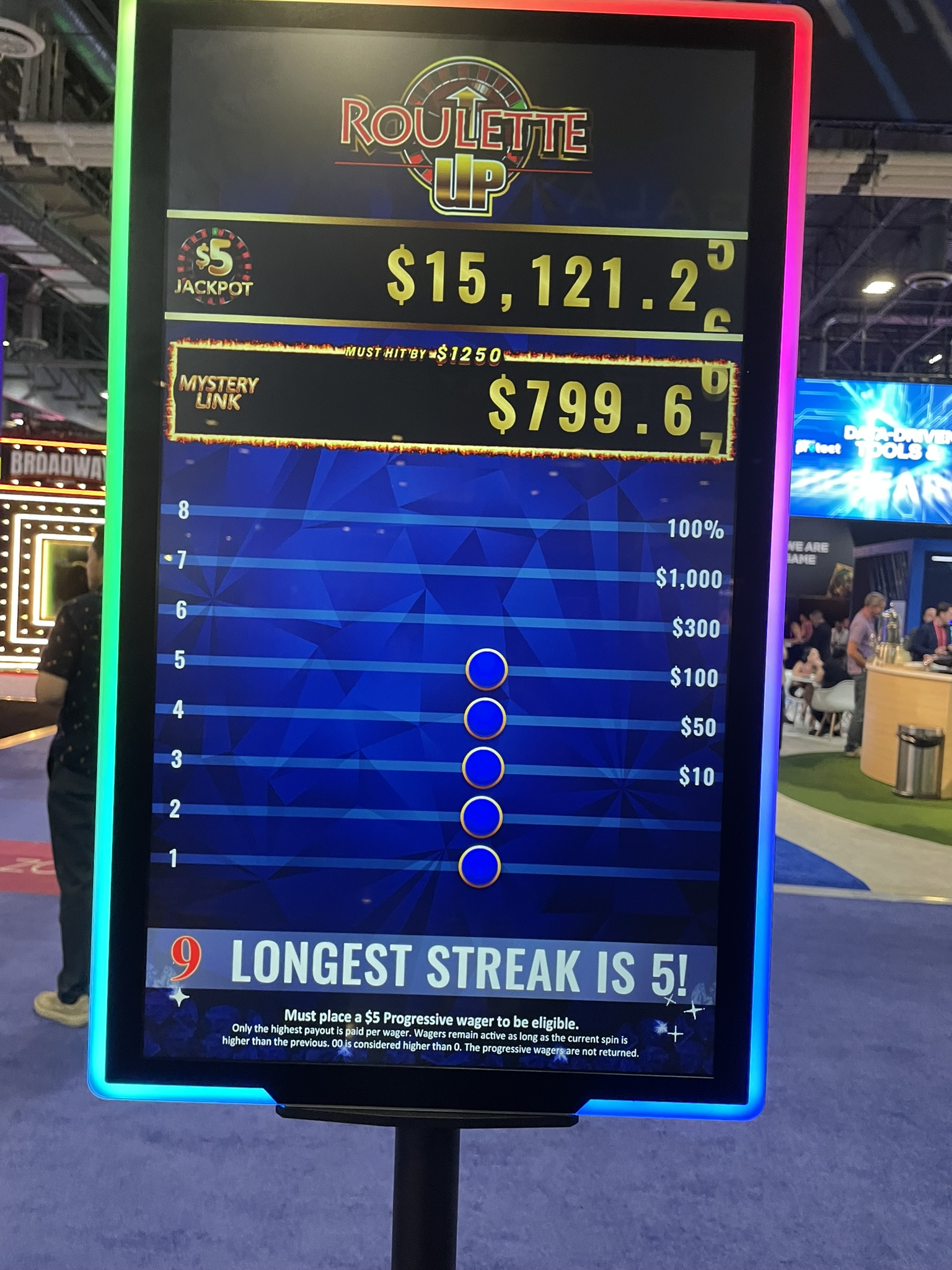 - このゲームの看板には、ランダムに当たるミステリー ジャックポットと、その当選上限額が 1,250 ドルであることも記載されています。