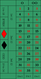 ゼロやダブルゼロと同様に、イーブンマネーベットはすべて、ボールがグリーンに止まった場合は負けとなります。1から36までの数字の並びは、シングルゼロルーレットと同じです。0、00、ロゴはすべて連続しており、ロゴは中央にあります。