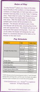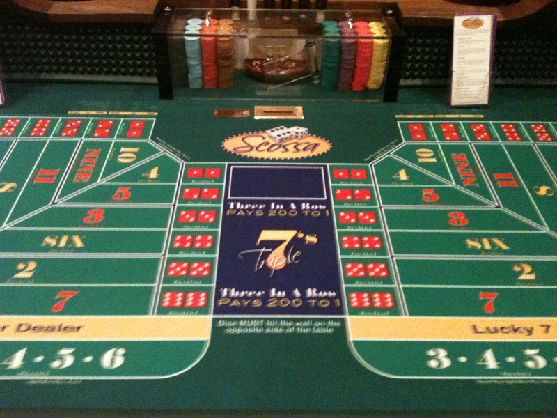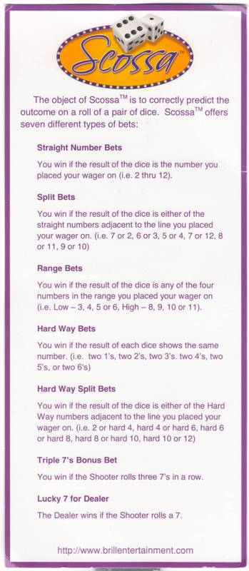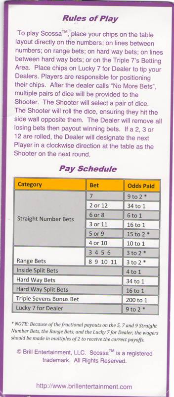 スコッサは、2011年5月17日にラスベガスのレッドロックで見つけたダイスゲームです。当時テーブルは閉まっていましたが、ありがたいことにルールカードが用意されていました。「スコッサ」はイタリア語で「投げる」という意味で、サイコロを投げるという意味です。