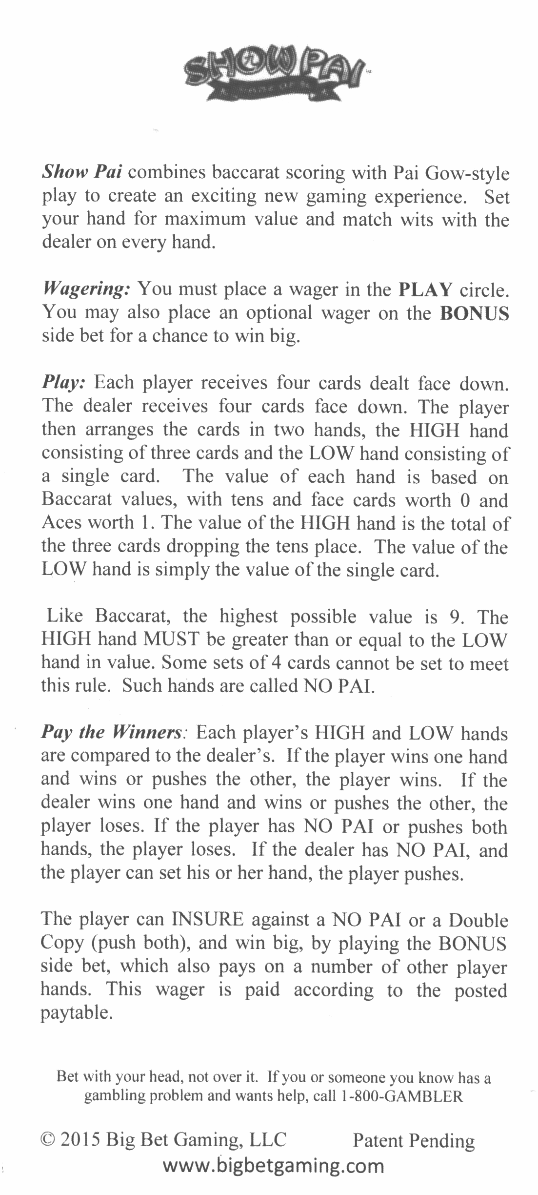 ショーパイは、バカラのスコアリングとパイゴウの形式を組み合わせた、非常にシンプルなテーブルゲームです。このゲームは2016年初頭にラスベガスのパレスステーションでデビューしました。ゲームは覚えやすく、プレイも簡単で、ハウスエッジも比較的低くなっています。