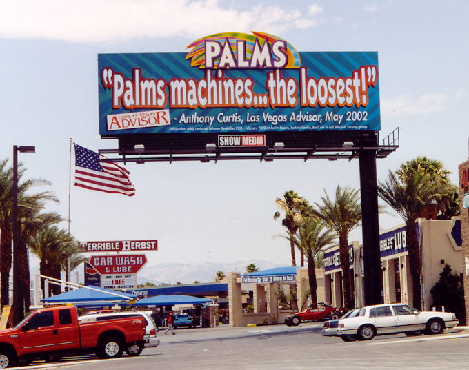 上記の看板はパームスの向かい側にあります。この調査は私が行ったものですが、アンソニー・カーティスがラスベガス・アドバイザー誌に掲載したことで広く知られるようになりました。看板の「…」には多くの情報が含まれていますが、都合よく省略されています。実際には、調査ではラスベガスで調査対象となったカジノの中で、パームスのビデオスロットの5セントが最も低かったとだけ書かれています。下部の小さな文字には、「2001年11月から2002年2月にかけて、オースティン・パワーズ、フォーチュン・クッキー、リールエム・イン、ホイール・オブ・フォーチュンのゲームについて独自調査を実施。レオパード・スポッツは除外し、調査は10月から開始しました」と書かれています。