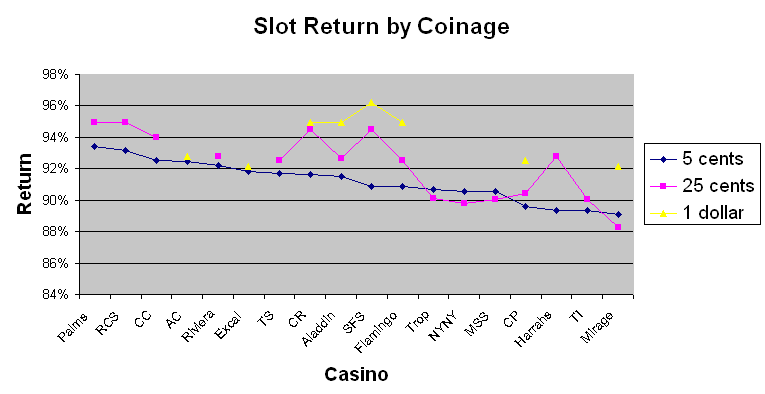 以下の表は、25セント硬貨または1ドル硬貨のビデオディスプレイスロットマシンを少なくとも1台見つけたすべてのカジノをリストアップしたものです。表には、5セント硬貨、25セント硬貨、1ドル硬貨の配当が、5セント硬貨の配当でソートされて表示されています。一部のカジノでは、5セント硬貨から25セント硬貨にかけて配当がわずかに下がることにお気づきになるかもしれません。これはサンプルのばらつきによるものです。機種によっては配当が高い傾向があり、25セント硬貨レベルの機種は配当が低い傾向があります。ここに記載された5セント硬貨の配当は、付録3Aの配当と一致しない場合があります。これは、付録3aが最新の結果を反映しているのに対し、この付録はそうではないためです。