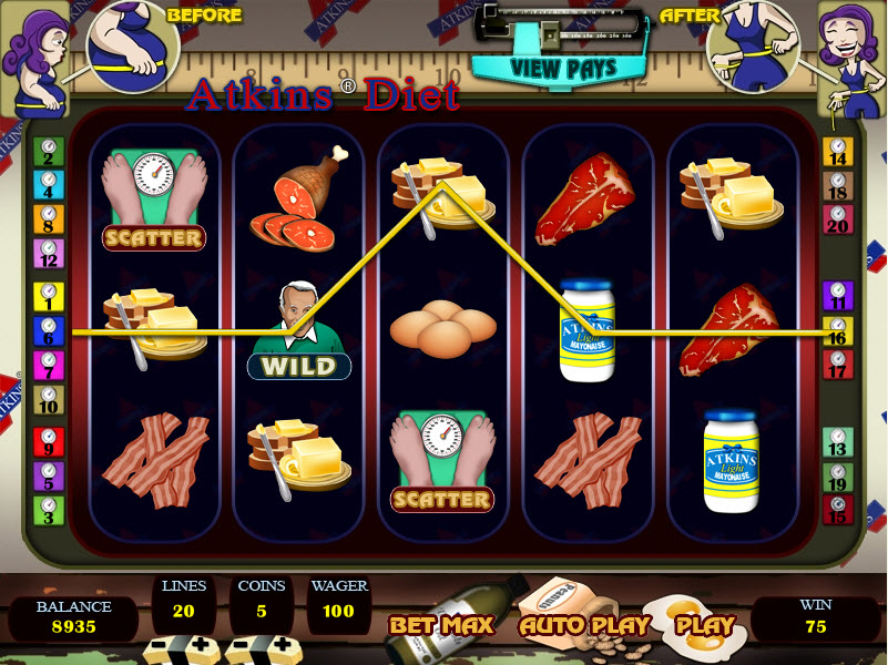 2008年、オーストラリアのシドニーで開催されたスロットマシンに関するカンファレンスでの講演用に、アトキンスダイエットスロットマシンを設計しました。このスロットマシンは、ビデオスロット(ポキーとも呼ばれる)の設計例として使用されました。まず、ペイテーブルとリールストリップを紹介し、次に様々な勝ち方における確率とリターンについて解説します。
