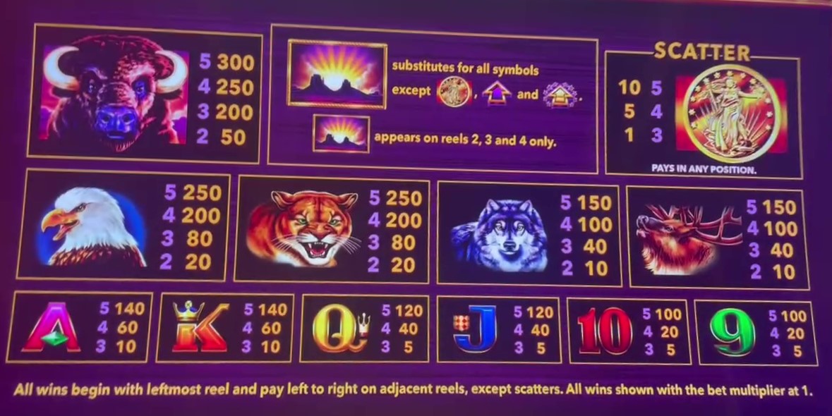 - ラインペイシンボルは、バッファロー、ワシ、クーガー、オオカミ、トナカイ、A、K、Q、J、10、9 です。