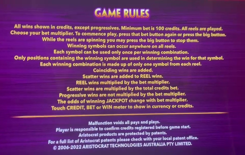 - プログレッシブ ジャックポットを除き、すべての勝利はクレジットの価値に比例します。