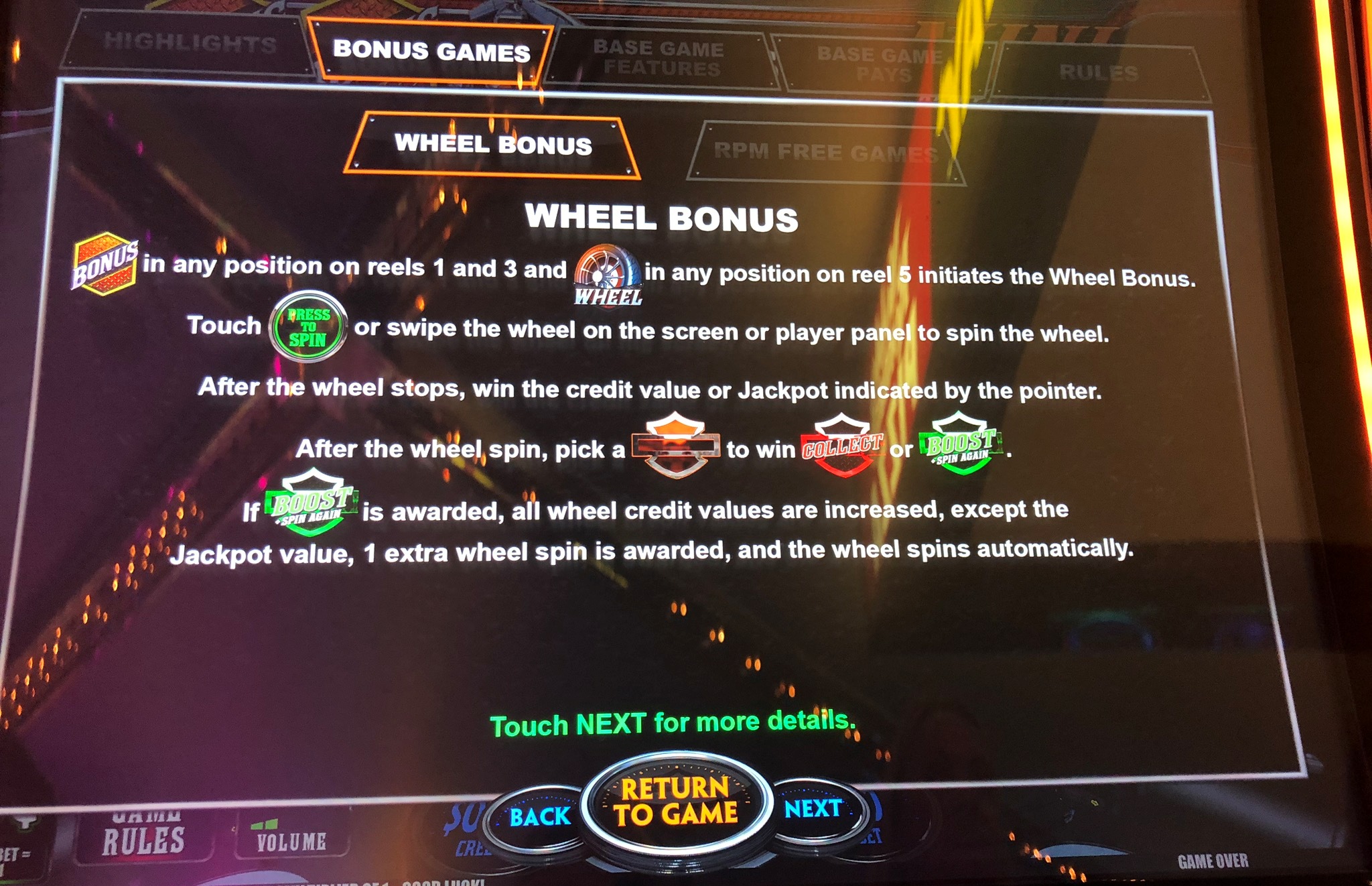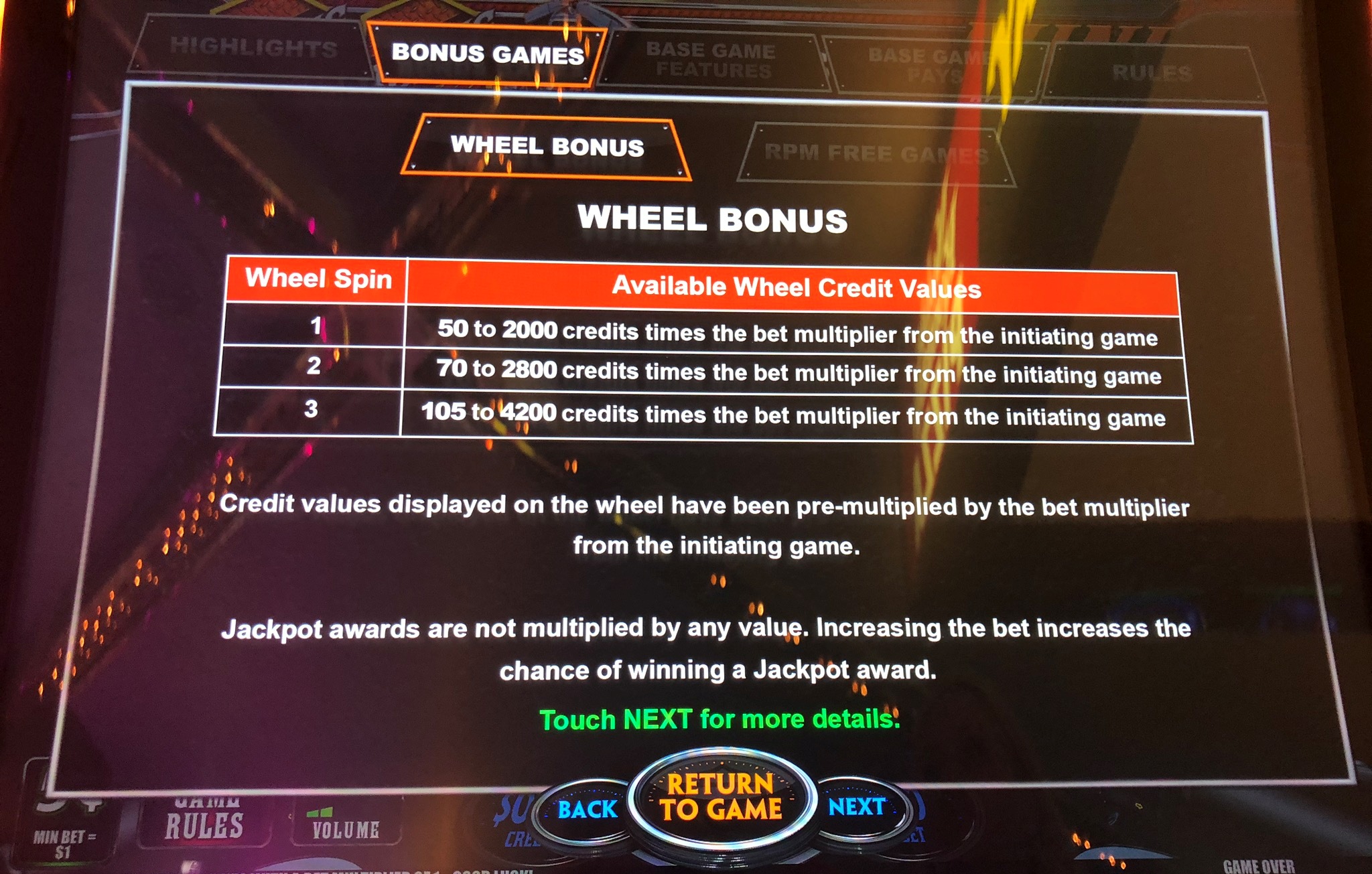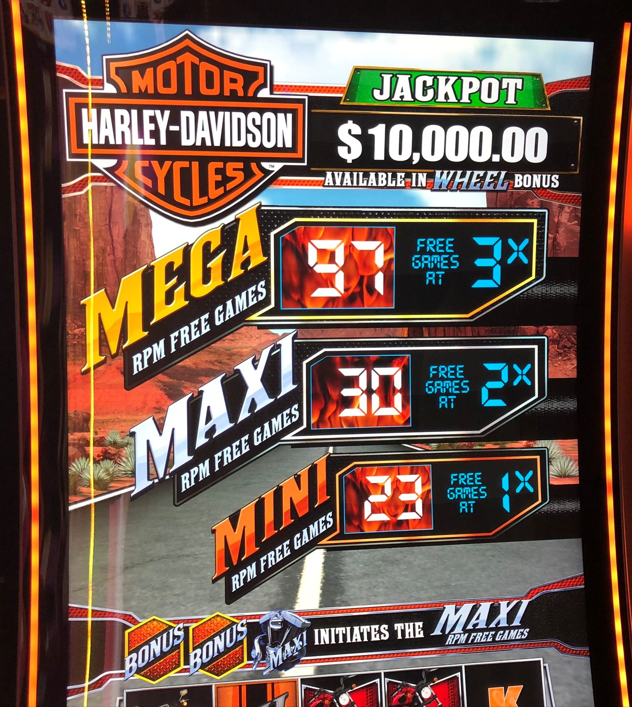この記事に掲載されているラスベガスのフォー・クイーンズにあるマシンは、ホイールの最大賞金が1万ドルでした。ハーレーダビッドソンの他のマシンの中には、ホイールにプログレッシブ・ジャックポットが搭載されているものもあります。もしそうであれば、ある時点での期待値は、そのプログレッシブ・ジャックポットの関数となるはずです。ジャックポットの額が具体的にどのように影響するかは、残念ながら私には分かりません。