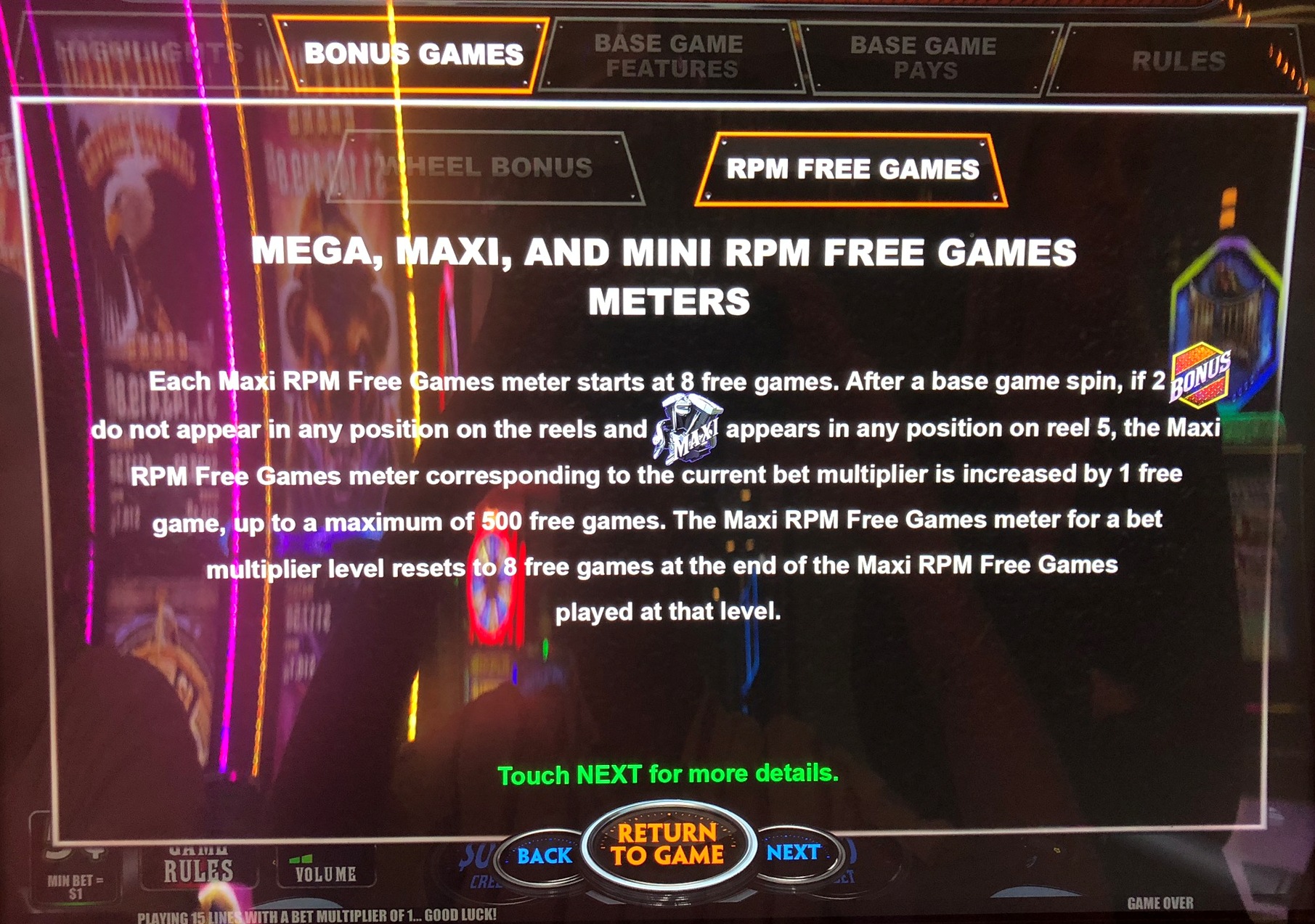 プレイヤーがスキャッターシンボルを0個または1個獲得し、フリーゲームボーナスシンボルのいずれかを獲得した場合、そのフリーゲームボーナスシンボルのメーターにフリーゲームが1回追加されます。例えば、マキシフリースピンボーナスのメーターに20回のフリースピンがあり、次のスピンでリール5にマキシフリースピンシンボル(リール1と3のスキャッターシンボルが2個未満)が出現した場合、マキシフリースピンメーターは1増加して21になります。