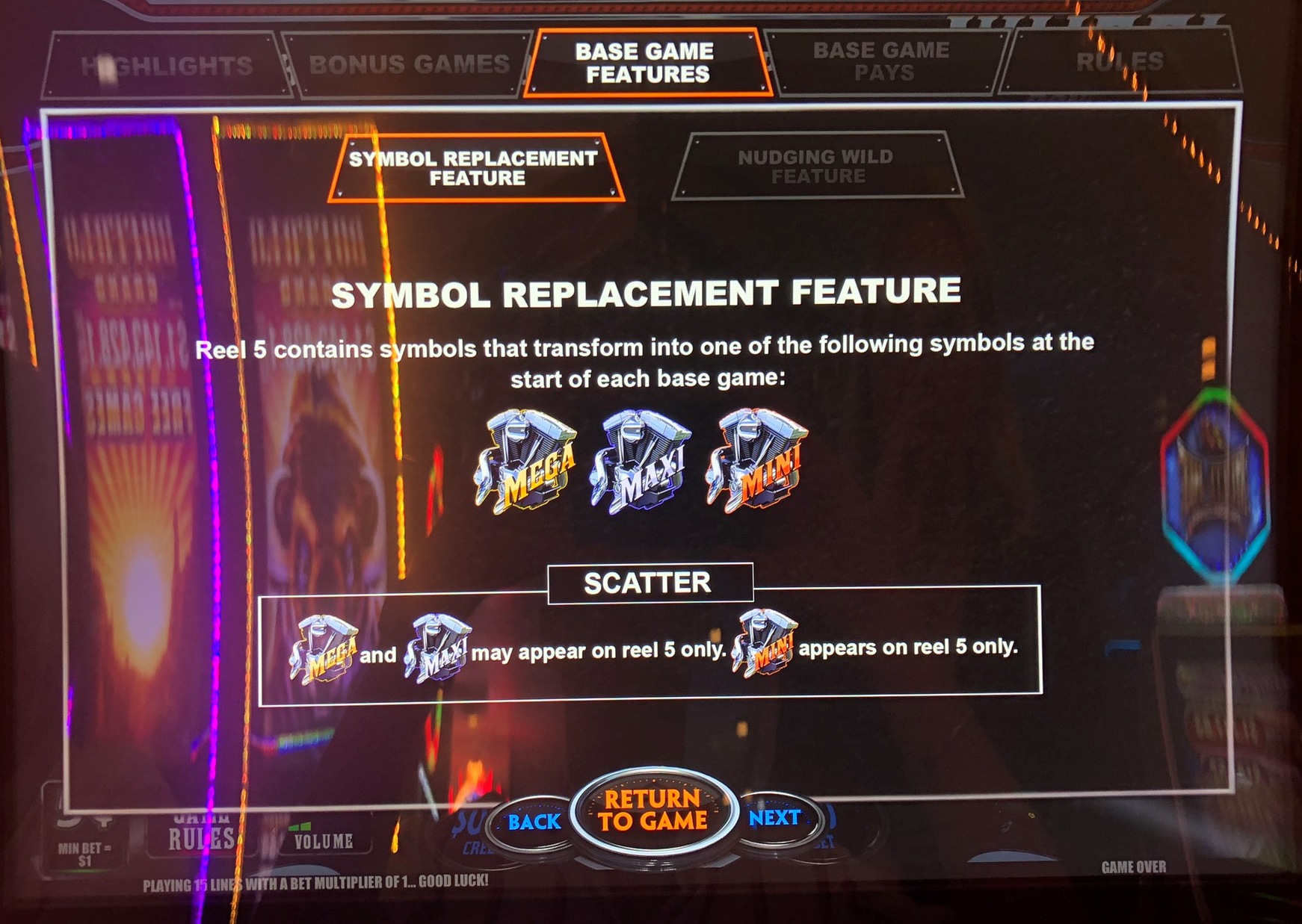 リール1と3にはスキャッターシンボル、リール5にはボーナスシンボルがあります。このゲームには「シンボル置換」機能があり、ワイルド、スキャッター、ボーナスシンボルといった特別なシンボルがランダムに他のラインペイシンボルと置き換わります。プレイヤーのベット額が高ければ高いほど、スキャッターとボーナスシンボルの出現数も増加します。