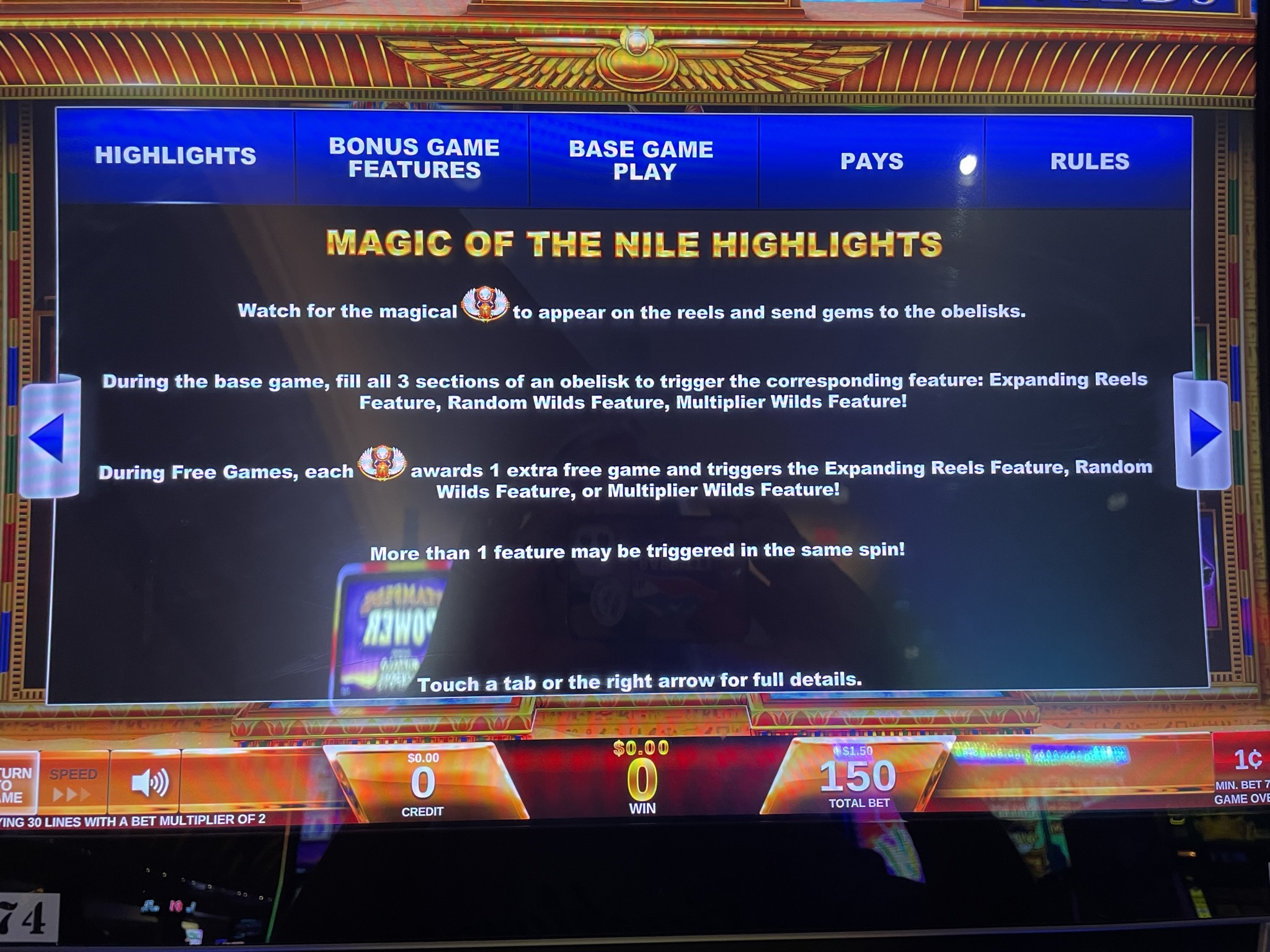 Magic of the Nileは、プレイヤーに有利な状況をもたらす変動ステートスロットマシンです。このゲームのポイントは、プレイヤーが宝石を集めることにあります。宝石は赤、青、緑のいずれかです。同じ色の宝石を3つ集めると、フリーフィーチャースピンがプレイされ、通常は賭け金の10倍から25倍の配当が得られます。
