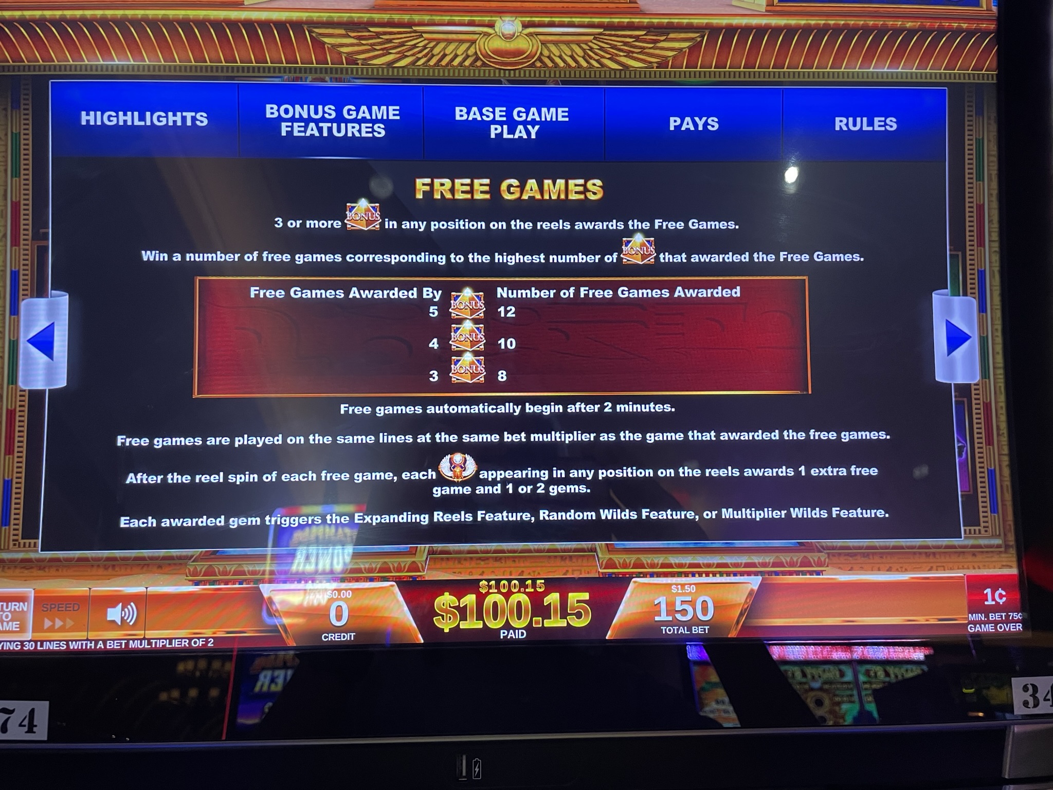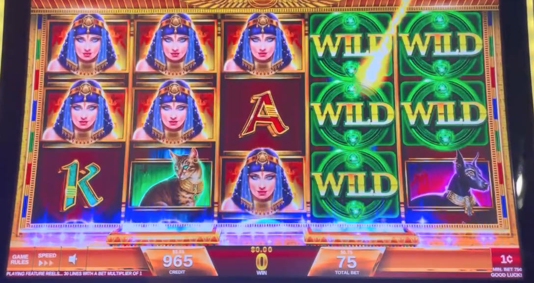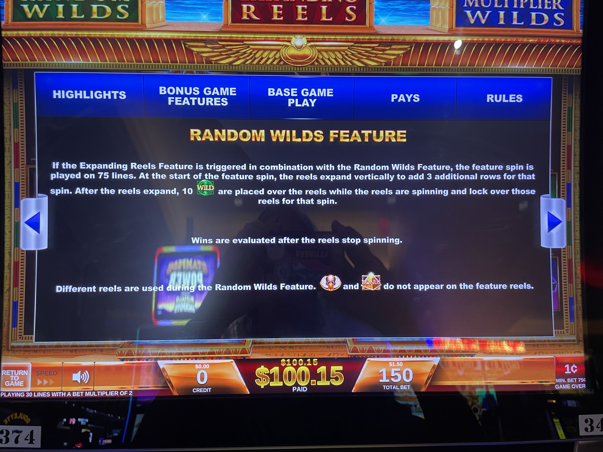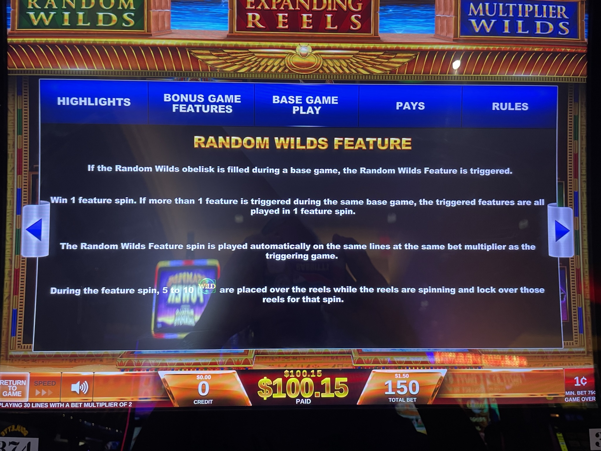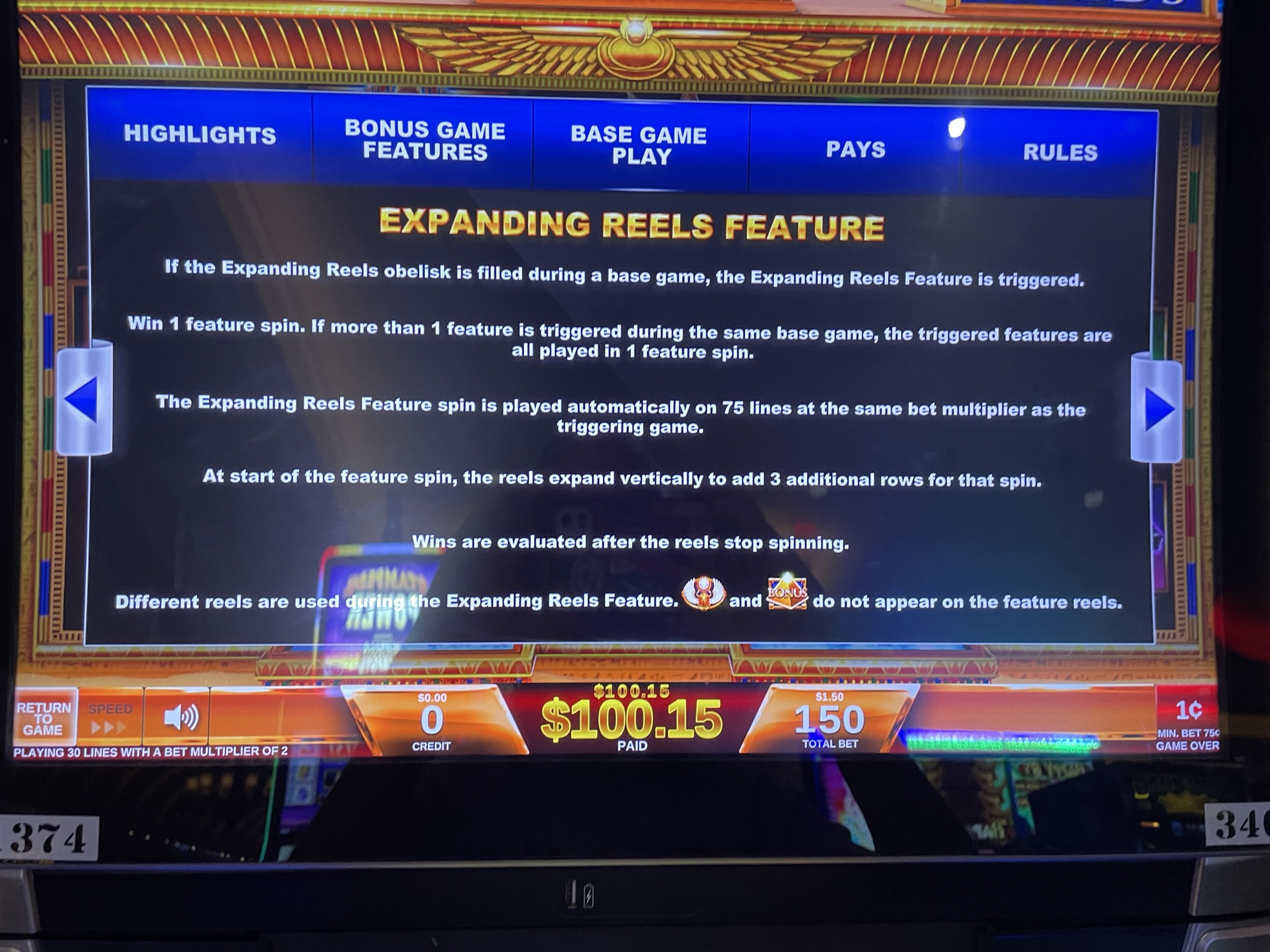赤いオベリスクのピースを3つすべて揃えると、ランダムワイルドフィーチャースピンを獲得できます。このフィーチャースピンでは、リールが3列から6列に拡張されます。さらに重要なのは、ペイライン数が30から75に増加したことです。リールのストリッピングもより頻繁に行われるはずです。