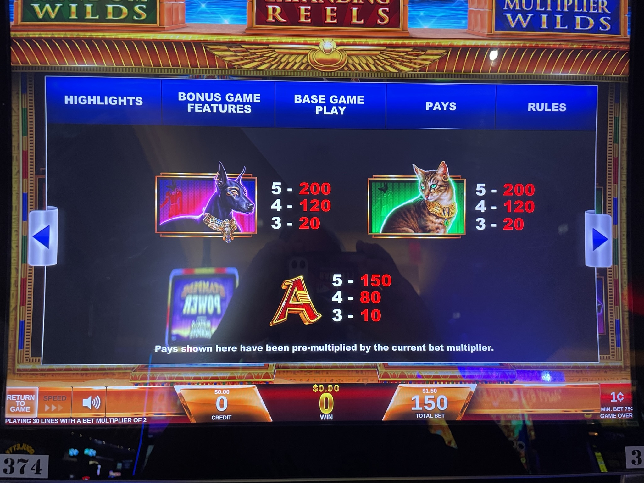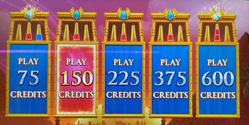 このゲームには5つの異なるベットレベルがあります。それぞれが独立したゲームのように、別々の状態に置かれています。スロット好きのプレイヤーにとって嬉しいことに、ベットパネルには5つのレベル全てで点灯しているオベリスクの各ピースの数が表示されます。さらに分かりやすくするために、オベリスクの上にある宝石が少なくとも2つ点灯している場合、ダイヤモンドのように輝いて表示されます。例えば、下の画像では、$0.75と$6.00のベットレベルではそれぞれ2つのピースが点灯しており、オベリスクの上にある宝石が輝いています。