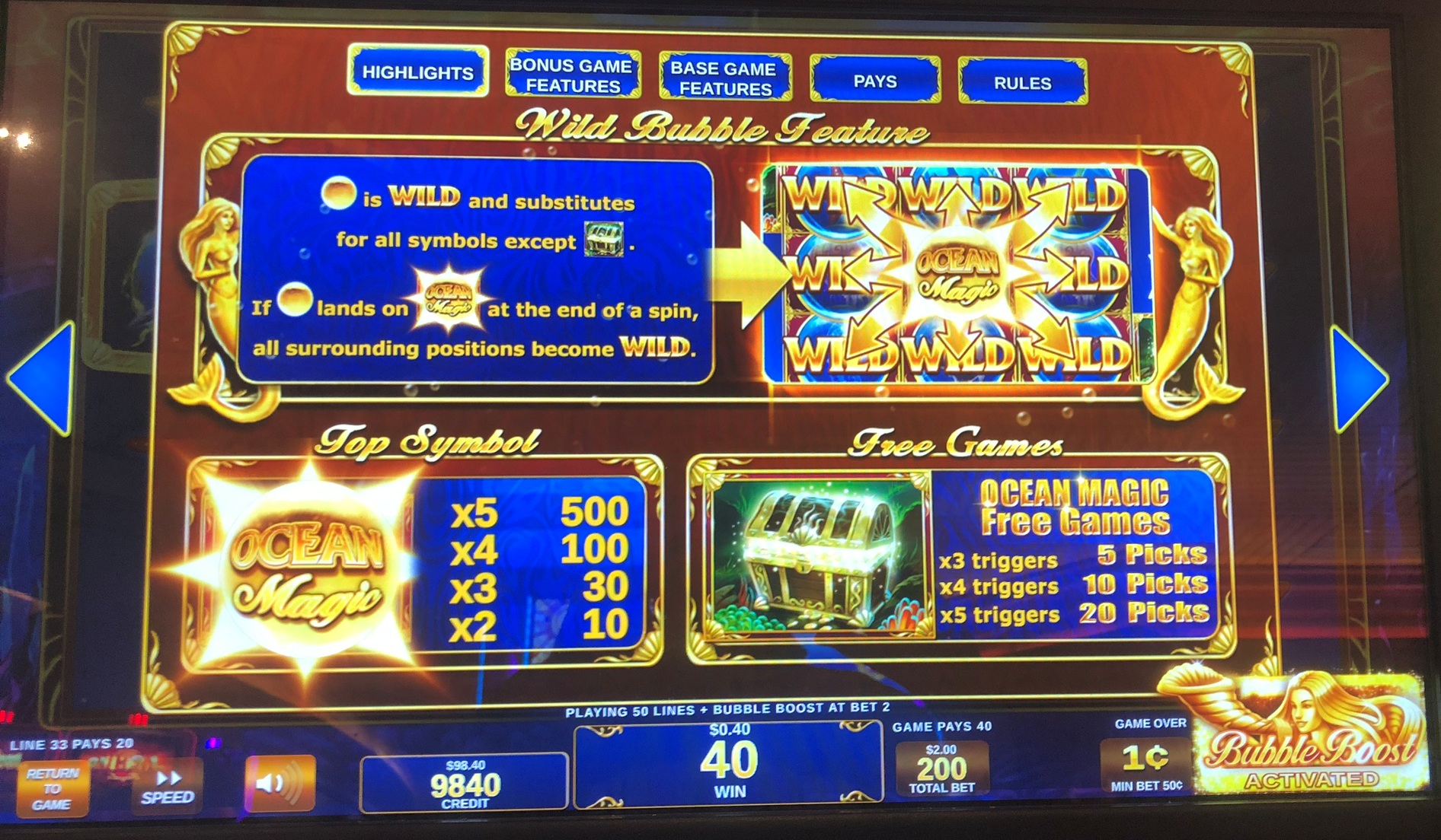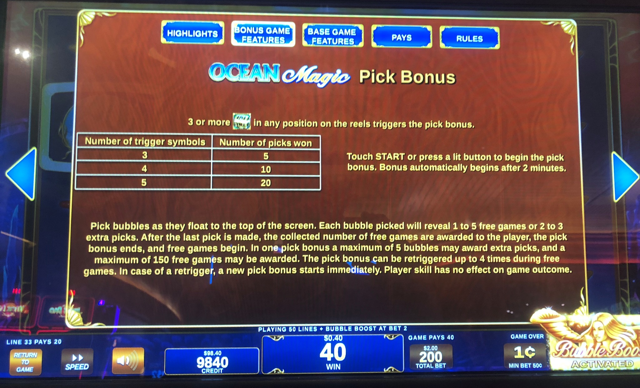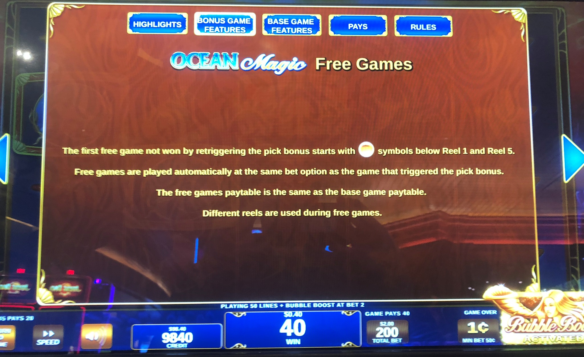 オーシャンマジックは、IGT社製の「可変状態」スロットマシンとも呼ばれています。ワイルドバブルがプレイごとに1列ずつ上に移動するのが特徴で、前のプレイヤーが良い位置でバブルを放棄した時にのみプレイすれば、プレイヤーに有利に働く可能性があります。