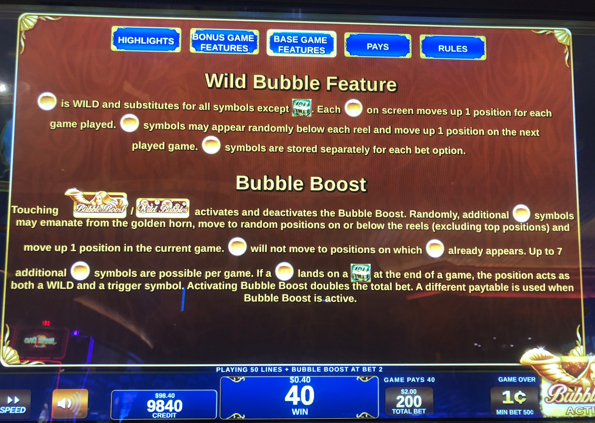 私のフォーラムでは、左上隅またはリール4の中央にバブルが出現するゲームについて、私と意見が異なる方がいらっしゃいます。これらの意見は、バブルバーストモードでプレイしているプレイヤーによるものだと思います。バブルバーストモードでは、バブルが1つ増えてもそれほど大きな意味はありません。ワイルドバブルモードでは、賭け金に対するラインペイアウトがバブルバーストモードの2倍になることを覚えておいてください。つまり、バブル1つの価値は約2倍になります。