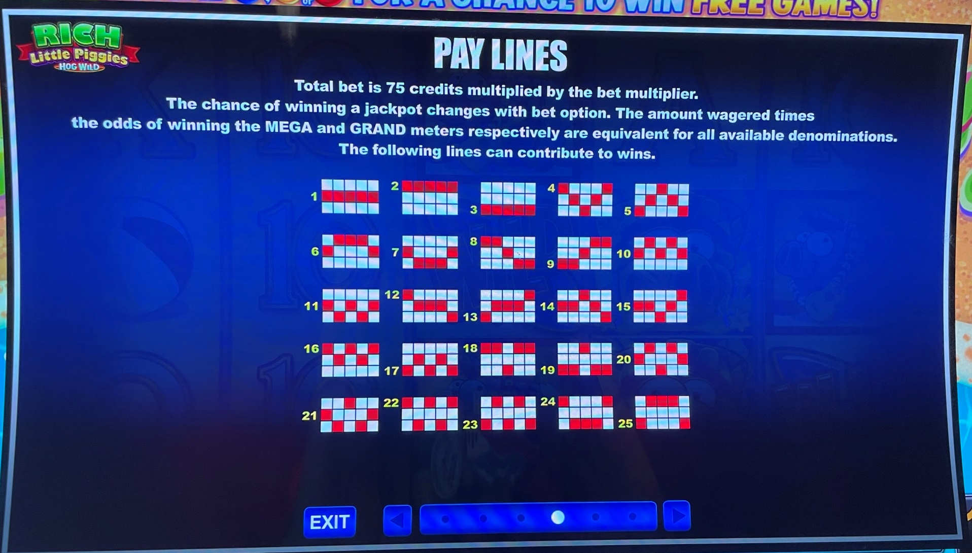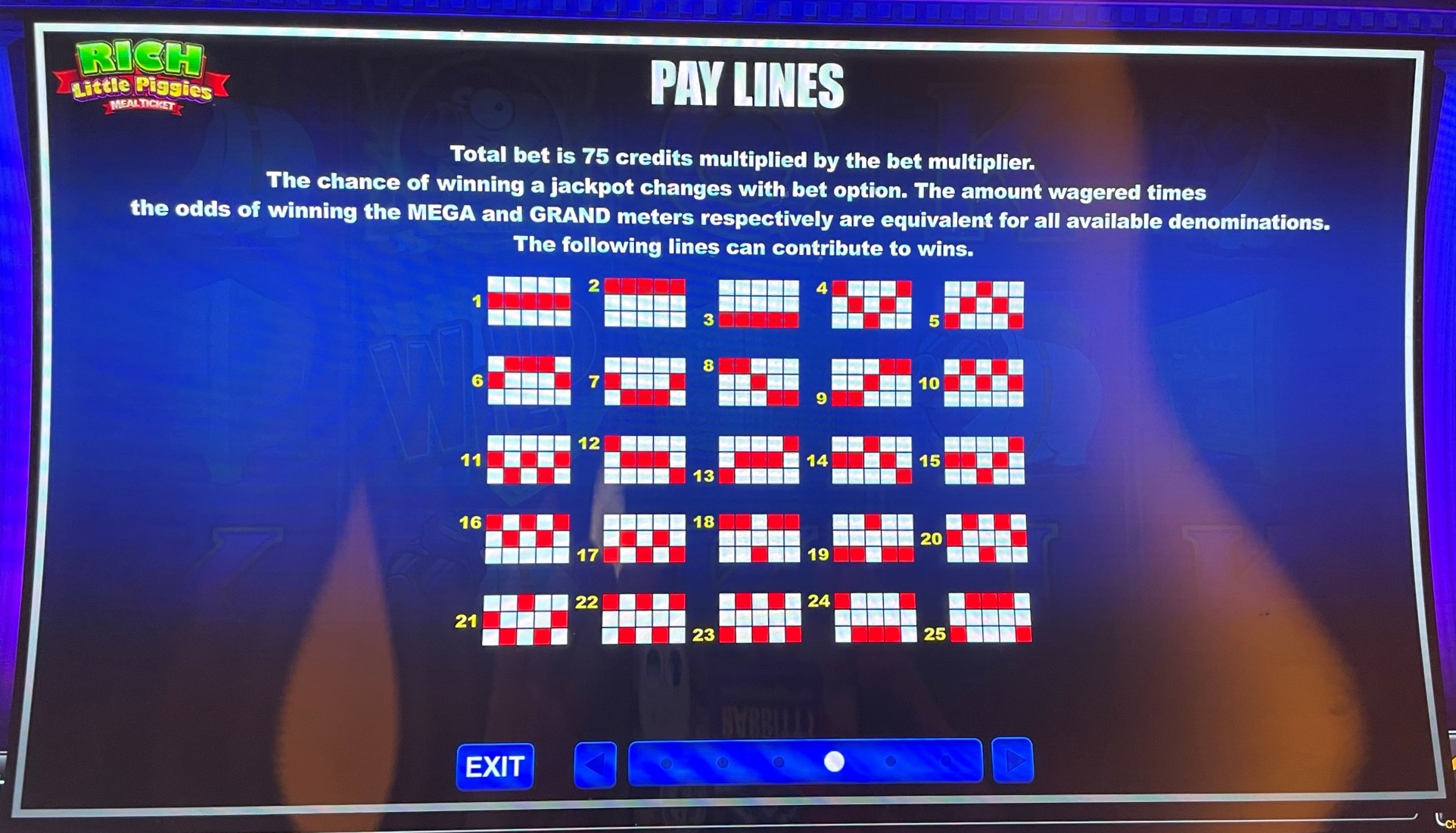 - ペイラインは25本あります。合計ベット額を25ペイラインで割ると、ペイラインあたりのクレジットベットは3、6、9、18、または24となります。