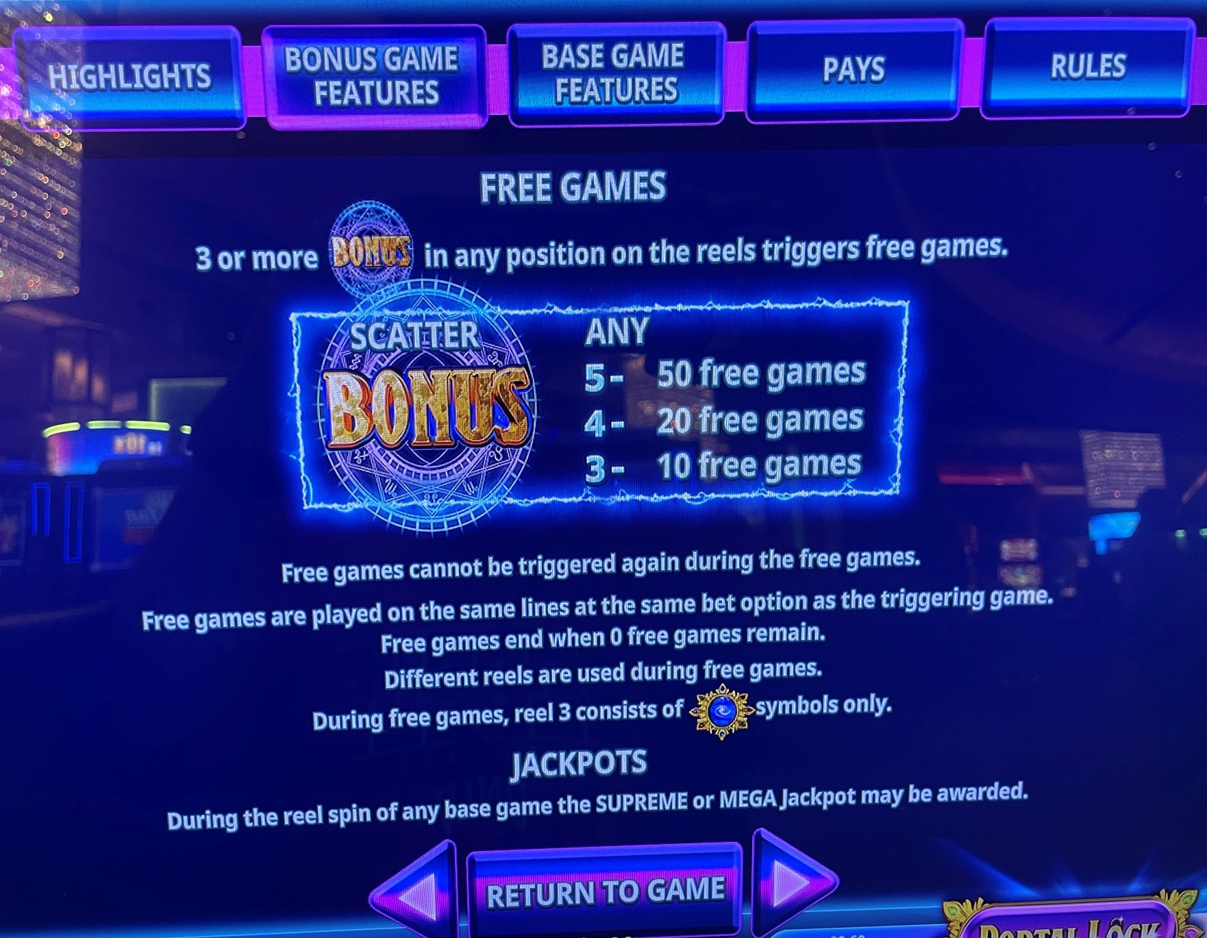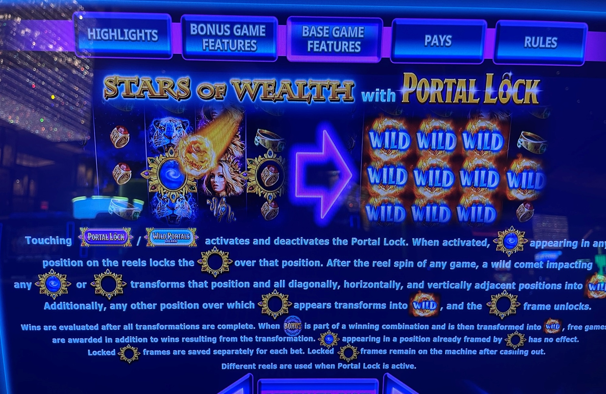 上記のルールセクションで述べたように、ワイルドポータルモードでは、次の条件を満たす隕石が命中するまで、フレームが画面上に残ります。特に最初の3つのリールで、画面上のフレームの数が多いほど、次のゲームでの価値が高まります。