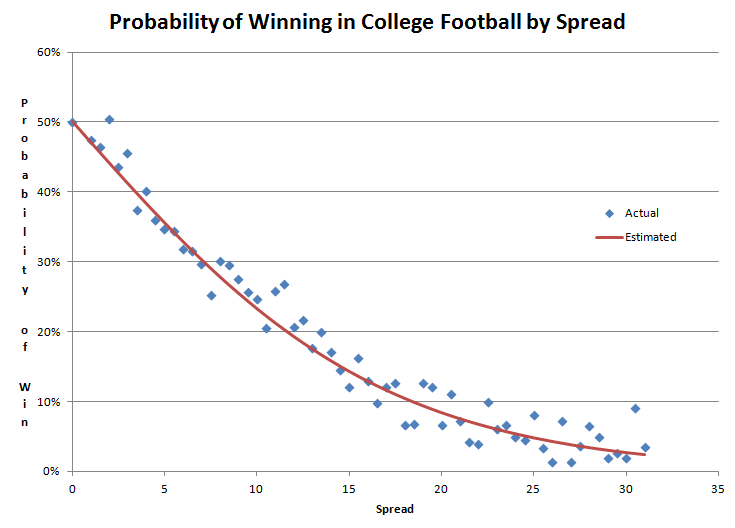 マネーラインでアンダードッグに賭けて良いと思う賭けは滅多にありません。以下のチャートは、過去のデータ(1983年から2005年)に基づいて、ポイントスプレッドごとの勝率を示しています。