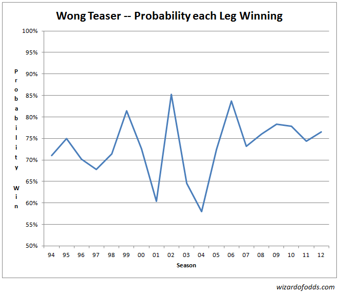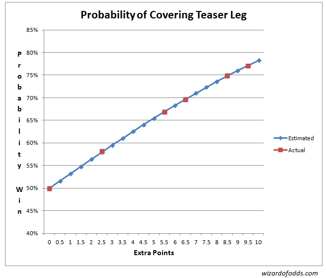 このページの分析は、1994年から2012年までのNFL4450試合に基づいています。2ポイントコンバージョンルールが導入された1994年から分析を開始しました。サンプルサイズのばらつきに加え、ティーザーカードのポイントスプレッドがどのように設定されるかについても仮定を置く必要がありました。時間を節約するため、既知の12種類のパーレーカードすべてを分析するのではなく、5種類だけを分析しました。追加ポイントが勝率にどのように影響するかを理解するために、ウィザードティーザー方程式を作成しました。