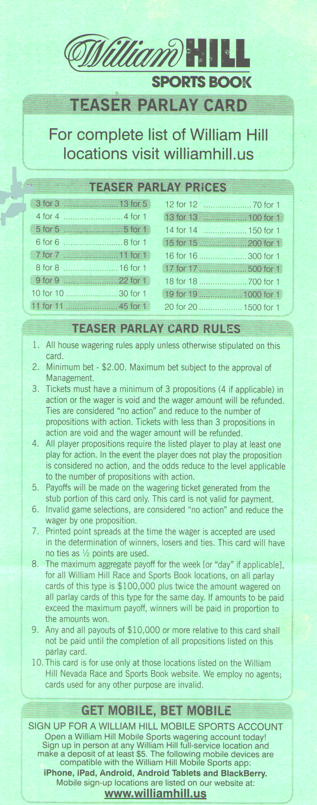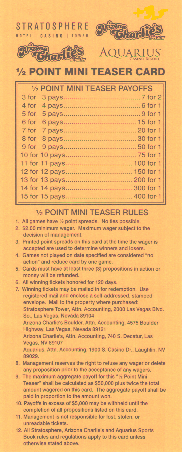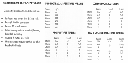 ベッターは、ティーザーの各レグで6、6.5、または7の追加ポイントを選択できます。当然のことながら、ベッターが獲得するポイントが多いほど、勝利の確率は低くなります。勝率はサイトによって異なるため、どのサイトが最も高いオッズを提供しているかは、私のペイテーブルを参照してください。しかし、面倒くさがりな読者のために、Jerry's Nuggetは、レグ数とポイント数を問わず、最も高いOTBティーザーオッズを提供しています。