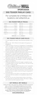 | ウィリアムヒル | 20~23歳 | 8時から5時まで | 13対5 | 4対1 | 6対1 | 8対1 | 10対1 | 15対1 | 20対1 |