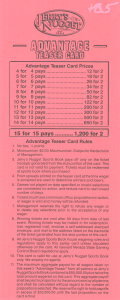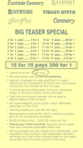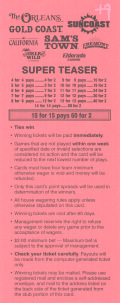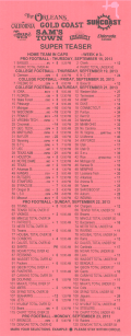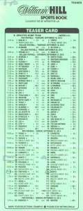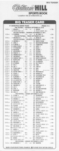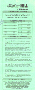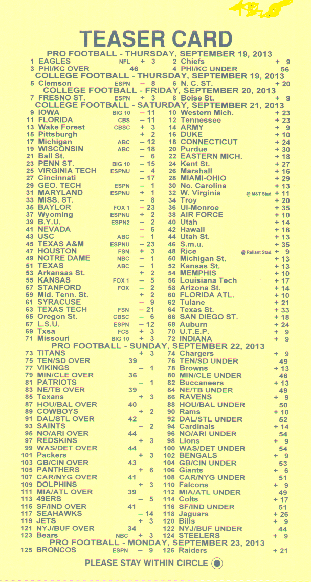 「オフ・ザ・ボード」(OTB)ティーザーは、賭ける時点でのベッティングボード上の現在のポイントスプレッドに基づいて行われます。カードに記入する必要はありません。代わりに、ベッターはティーザーのレグ数、各レグの追加ポイント数、パーレーしたいベット番号、そしてベット額をライターに伝えます。例えば、「3チーム、6ポイントのNFLティーザー、213、218、224番、$100」などと賭けることができます。