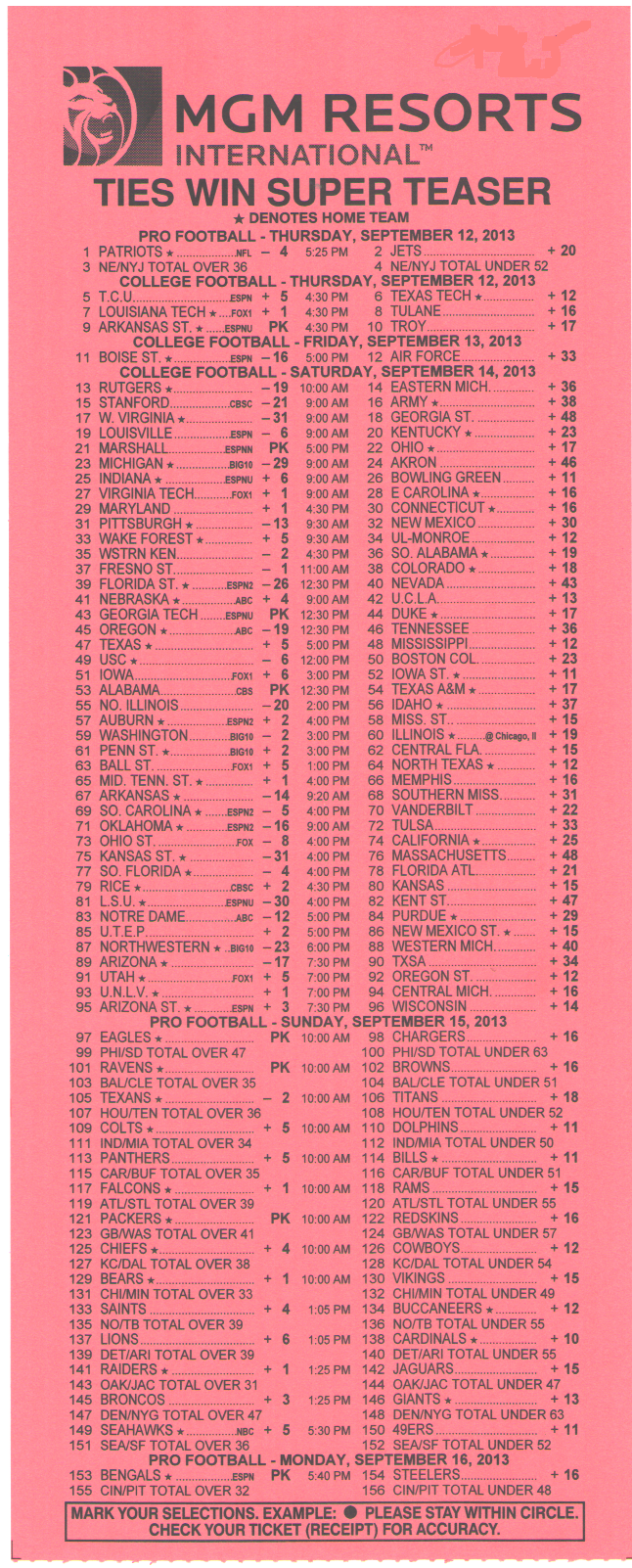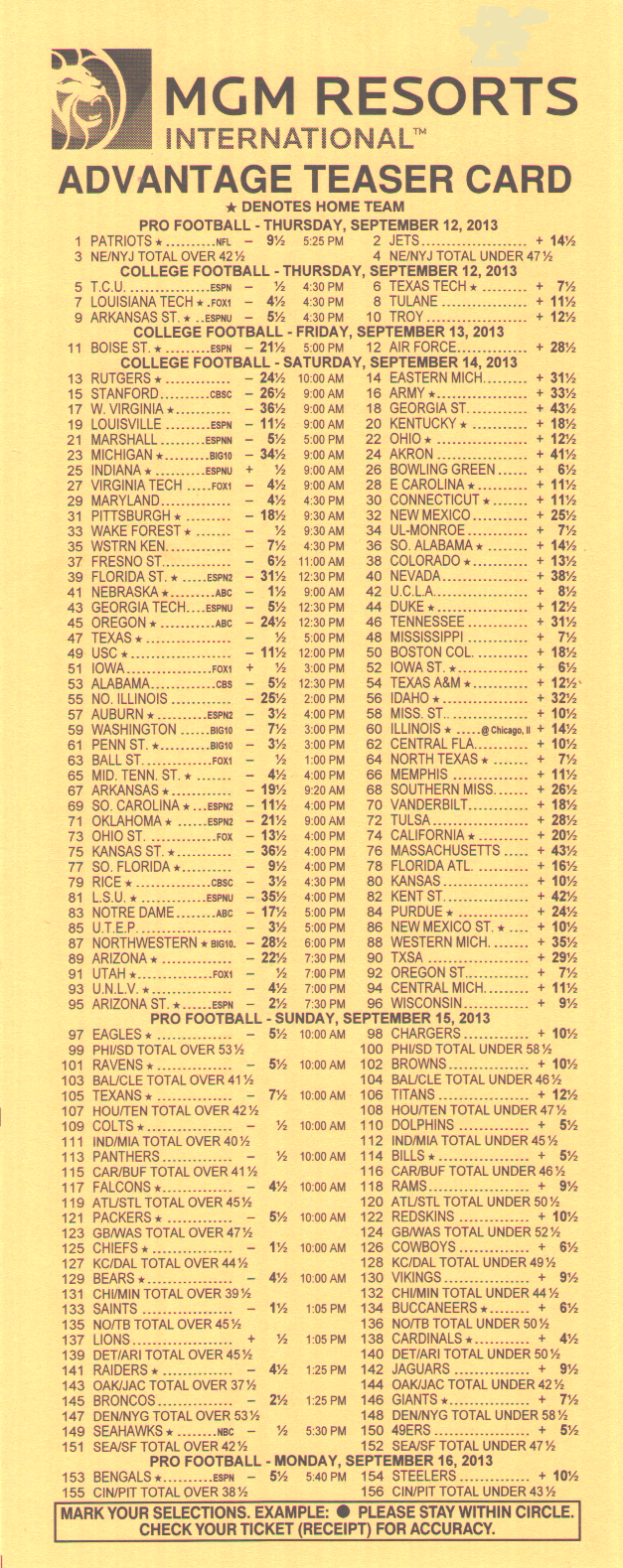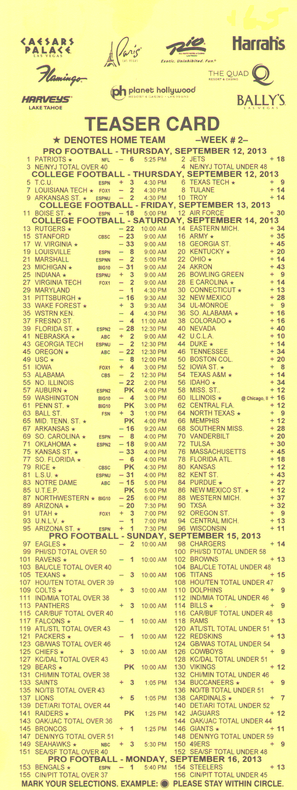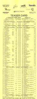 残念ながら、2レグで-110、3レグで+180、4レグで+300というNFLティーザーの6ポイントオッズは、2014年シーズンでドードー鳥の末路を辿ってしまったようです。最後のホールドアウトであるジェリーズ・ナゲットは、2014年シーズンのオッズを下げました。