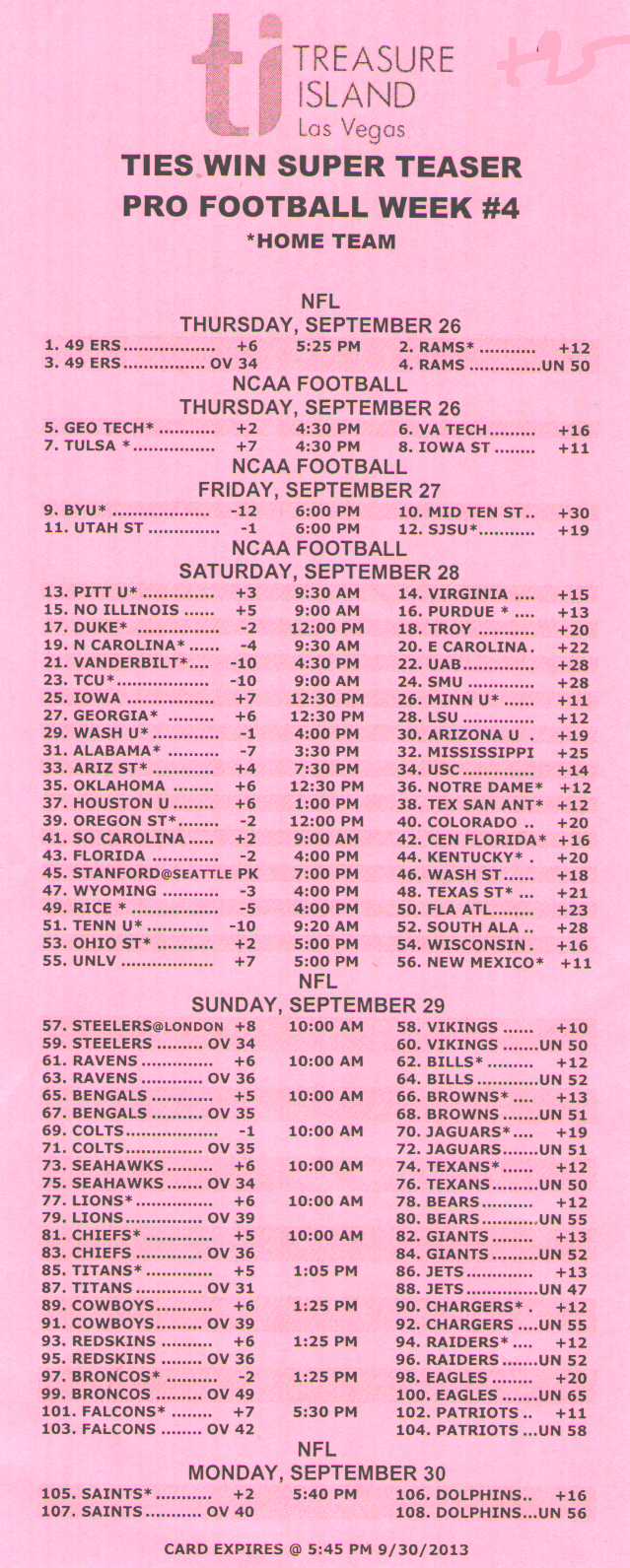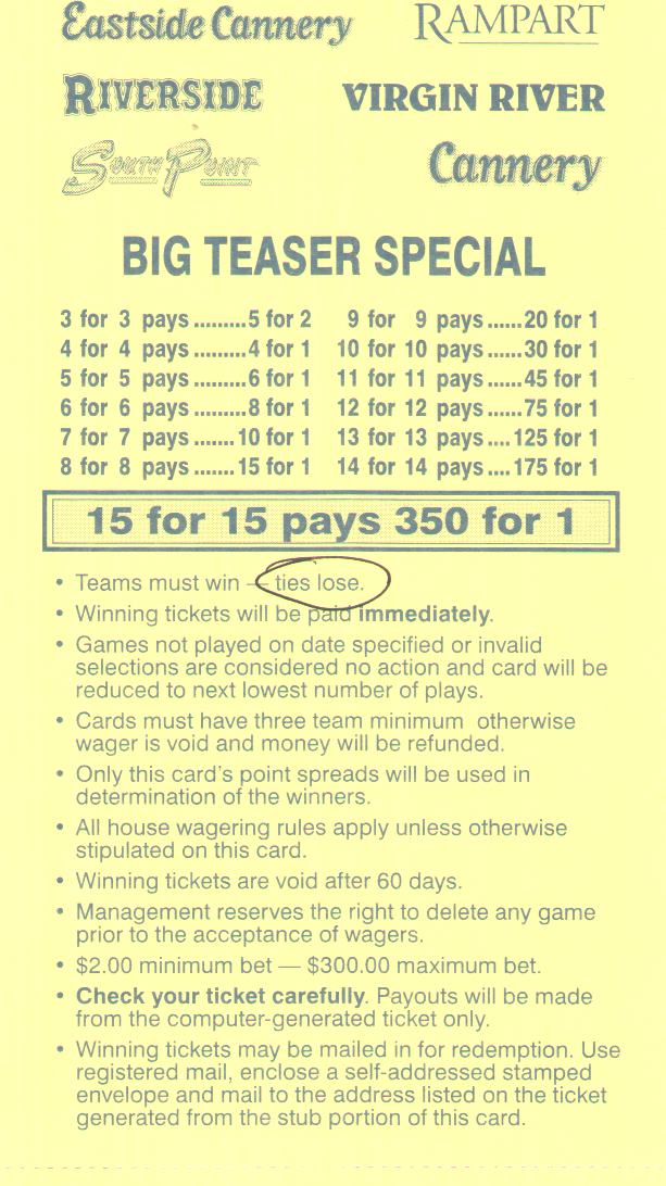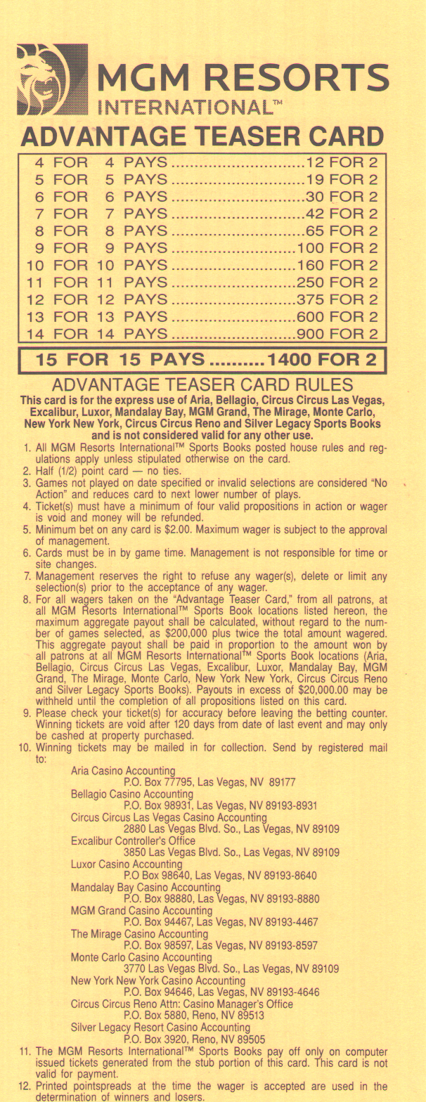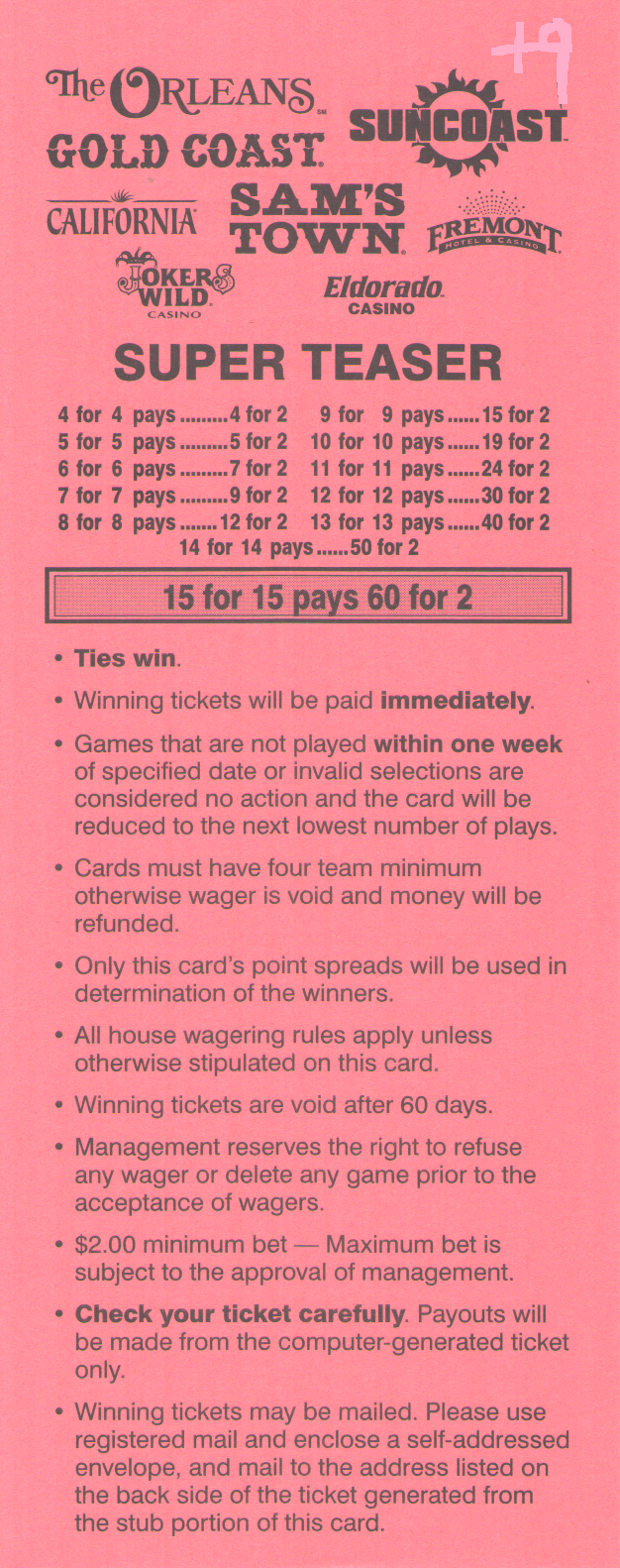 残念ながら、2レグで-110、3レグで+180、4レグで+300というNFLティーザーの6ポイントオッズは、2014年シーズンでドードー鳥の末路を辿ってしまったようです。最後のホールドアウトであるジェリーズ・ナゲットは、2014年シーズンのオッズを下げました。