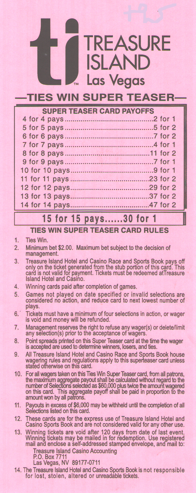 9.5ポイントのティーザーを提供しているスポーツブックは、Treasure IslandとWestgateの2つです。それぞれのペイテーブルは以下の通りです。ご覧の通り、Treasure Islandの方が一貫して高いオッズを提供しています。